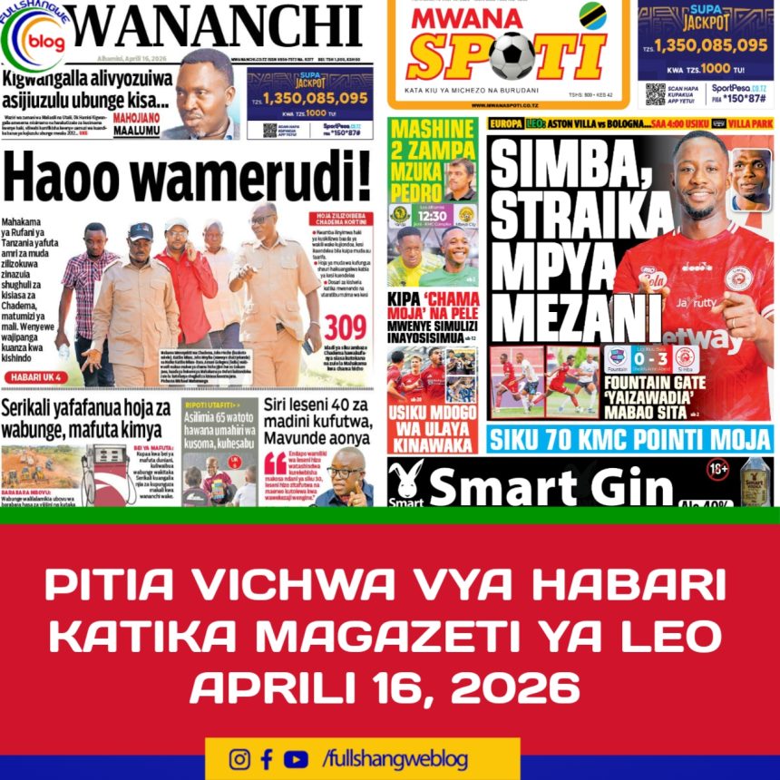 MagazetiPITIA VICHWA VYA HABARI KATIKA MAGAZETI YA LEO APRILI 16, 2026 Last updated: 2026/04/16 at 12:40 AM John Bukuku 3 days ago Share SHARE John Bukuku April 16, 2026 April 16, 2026 Share this Article Facebook Twitter Email Print Previous Article MABALOZI WASTAAFU KUONGEZA NGUVU KATIKA KUIMARISHA DEMOKRASIA YA NCHI Next Article WAANDISHI WA HABARI WAKUMBUSHWA NAFASI YAO KATIKA KUJENGA NCHI YENYE AMANI NA UTULIVU.