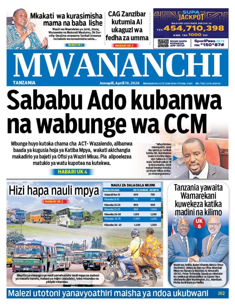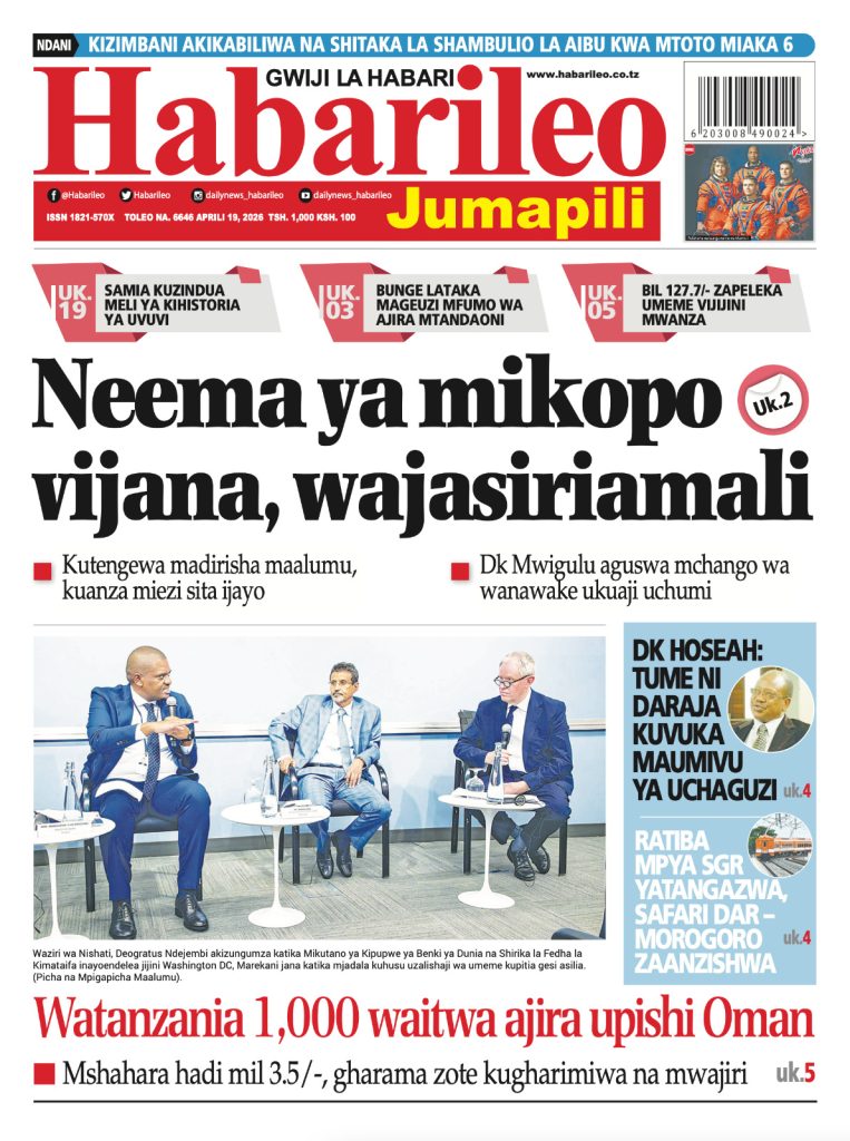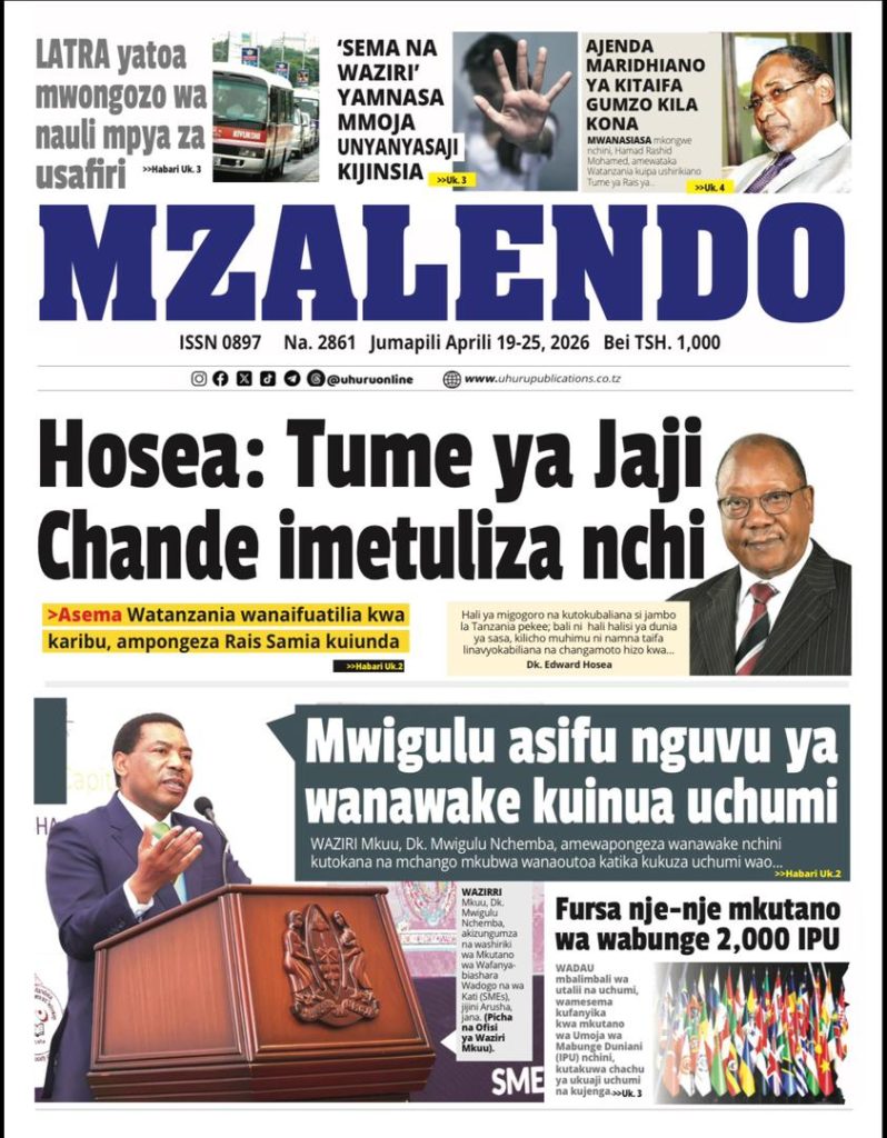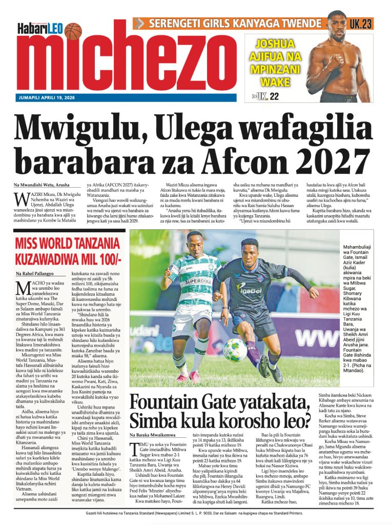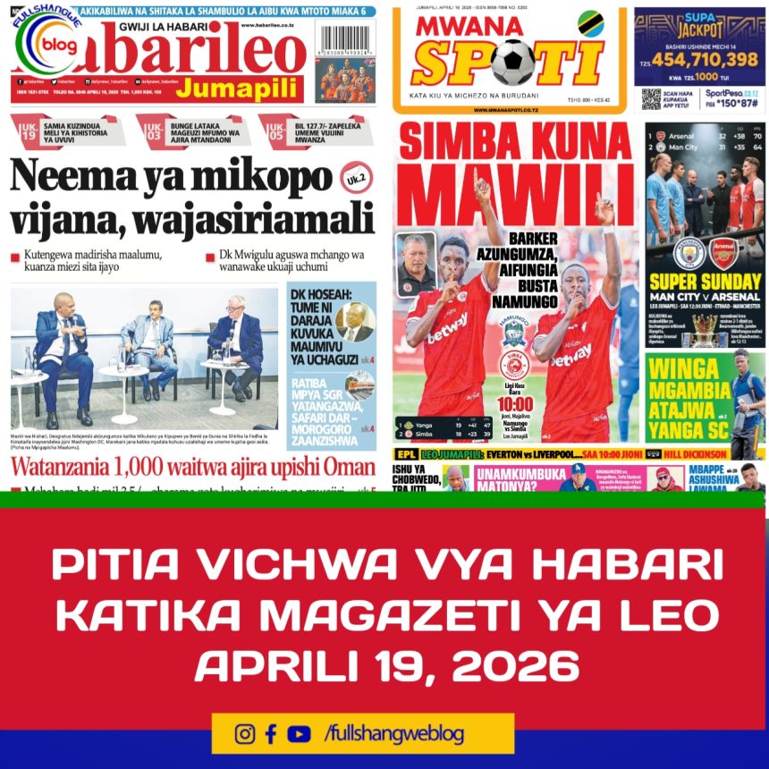 MagazetiPITIA VICHWA VYA HABARI KATIKA MAGAZETI YA LEO APRILI 19, 2026 Last updated: 2026/04/18 at 11:45 PM John Bukuku 30 seconds ago Share SHARE John Bukuku April 18, 2026 April 18, 2026 Share this Article Facebook Twitter Email Print Previous Article WATANO WASHIKILIWA KWA TUHUMA ZA WIZI WA MAGARI MKOANI MBEYA