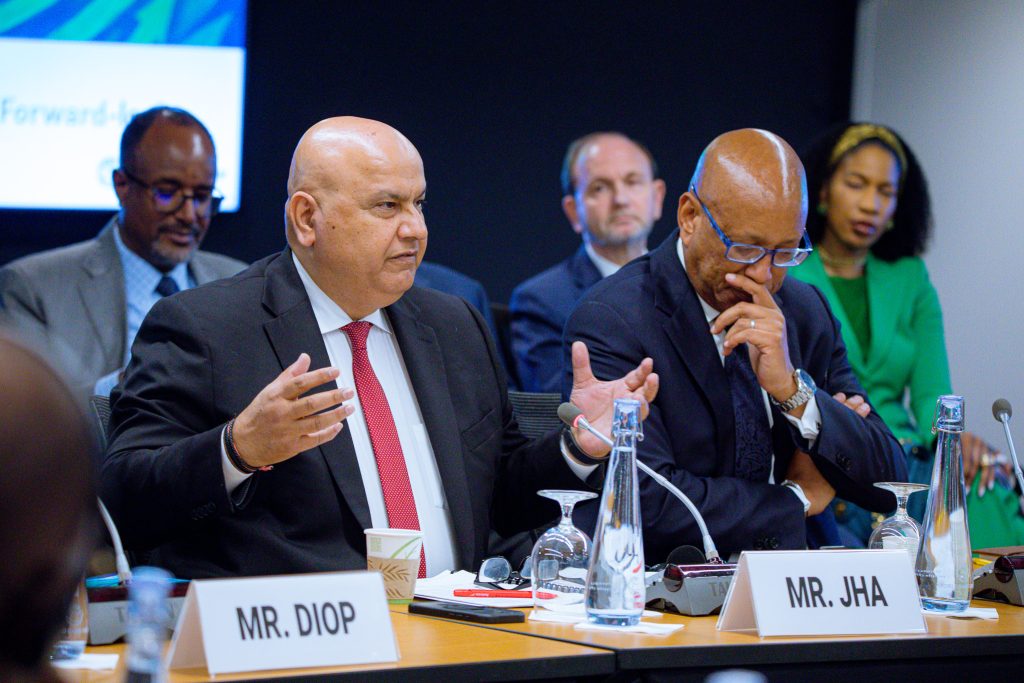 Waziri wa Fedha Mhe. Balozi Khamis Mussa Omar (Mb) (katikati), akizungumza na Makamu wa Rais wa Benki ya Dunia anayesimamia Kanda ya Afrika Mashariki na Kusini, Dkt. Ndiame Diop (kulia), wakati wa mkutano ulioangazia umuhimu wa sekta ya maji katika maendeleo ya watu na uchumi wa dunia, chini ya kauli mbiu “usalama wa maji kwa mustakabali wa bara la Afrika: mtazamo wa mbele” ulioandaliwa na Benki ya Dunia, pembezoni mwa mikutano ya majira ya Kipupwe ya Benki hiyo na Shirika la Fedha la Kimataifa-IMF, uliofanyika jijini Washington D.C, nchini Marekani. Kushoto ni Mkurugenzi wa Usimamizi wa Huduma za Kanda, Bi. Anna Wellenstein.(Picha na Kitengo cha Mawasiliano Serikalini, WF, Washington D.C, Marekani)
