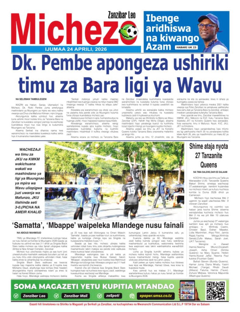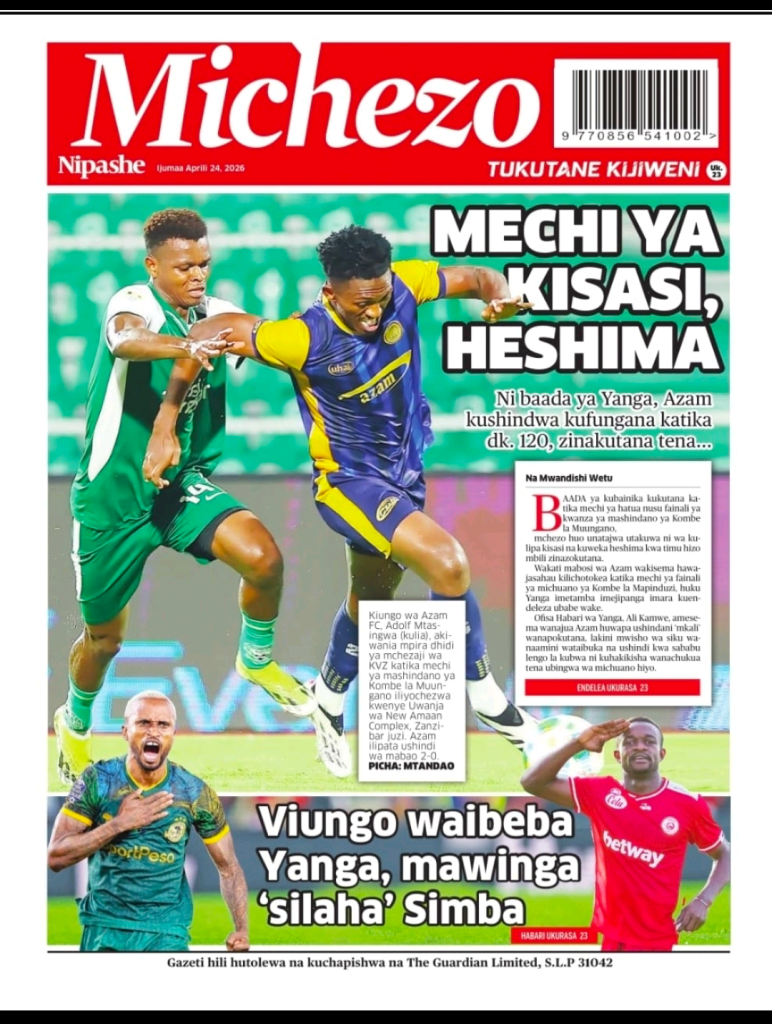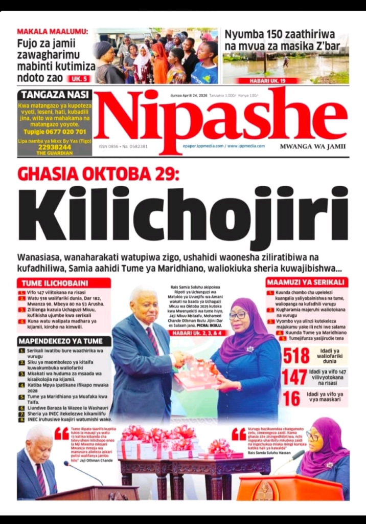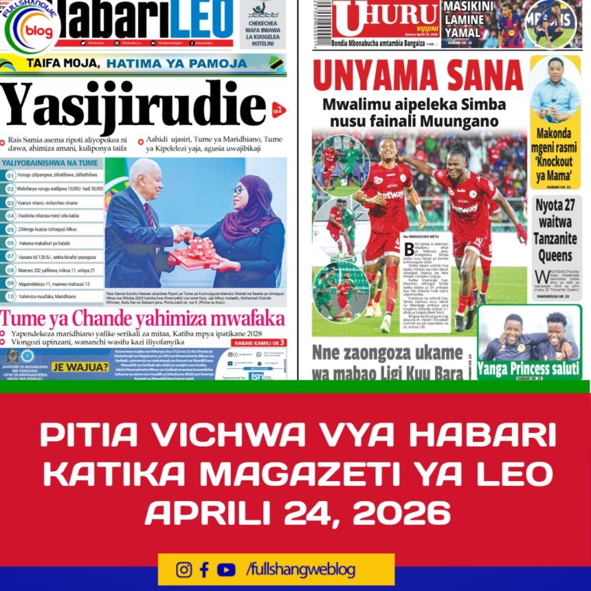 MagazetiPITIA VICHWA VYA HABARI KATIKA MAGAZETI YA LEO APRILI 24, 2026 Last updated: 2026/04/24 at 5:00 AM John Bukuku 4 hours ago Share SHARE John Bukuku April 24, 2026 April 24, 2026 Share this Article Facebook Twitter Email Print Previous Article SERIKALI YAHIMIZA USALAMA NA AFYA KAZINI KUELEKEA MAADHIMISHO YA APRILI 28 Next Article MWANG’ONDA AIPONGEZA RUWASA KWA USIMAMIZI MZURI WA MIRADI YA MAJI KISARAWE-PWANI