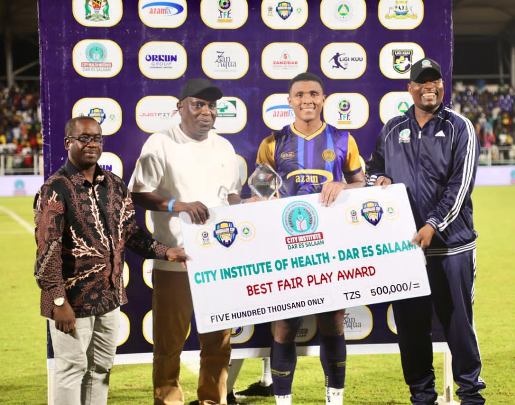 Waziri wa Nchi Ofisi ya Makamu wa Pili wa Rais, Sera, Uratibu na Baraza la Wawakilishi Mhe. Hamza Hassan Juma (wa pili kushoto) akikabidhi mfano wa hundi ya shilingi 500,000 kwa beki wa Azam FC Fuetes Mendoza aliyechaguliwa kuwa mchezaji aliyeonesha mchezo wa kiungwana zaidi (fair play) mara baada ya mechi ya nusu fainali ya Kombe la Muungano dhidi ya Yanga SC iliyochezwa Aprili 25, katika dimba la Amaan, Zanzibar. Zawadi hiyo imetolewa na Chuo cha Afya cha City Institute of Health Dar es Salaam. Kushoto ni Mkurugenzi wa Muungano Ofisi ya Makamu wa Rais Dkt. Juma Salum