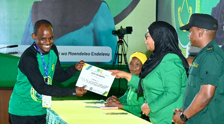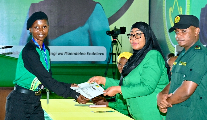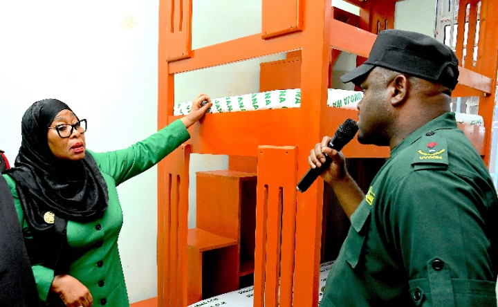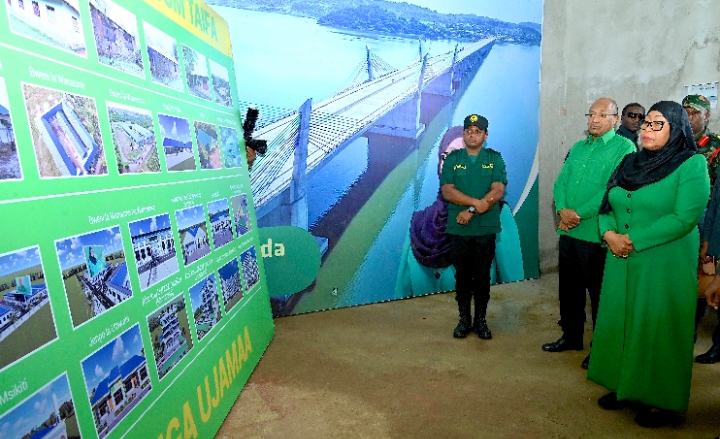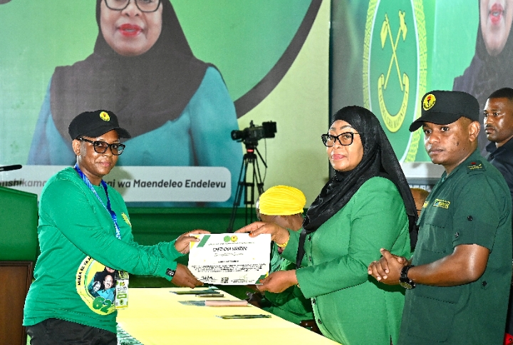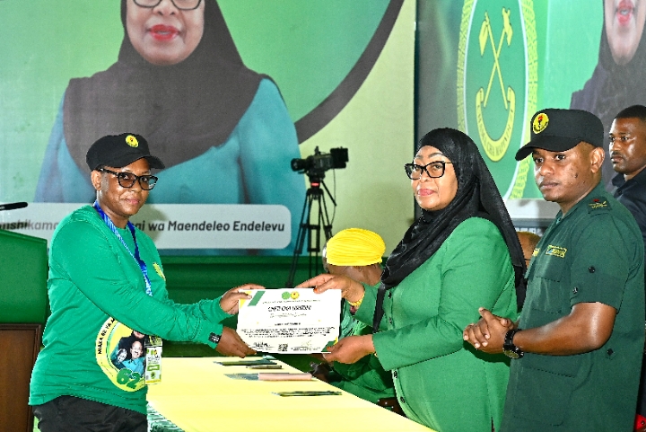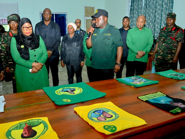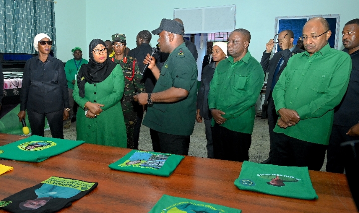Mwenyekiti wa Chama cha Mapinduzi (CCM) Taifa na Rais wa Jamhuri ya Muungano wa Tanzania, Mhe. Dkt. Samia Suluhu Hassan akisikiliza maelezo kuhusu Kiwanda cha Uchapishaji cha Chuo cha Umoja wa Vijana wa Chama cha Mapinduzi (CCM) kilichopo Tunguu, Zanzibar tarehe 26 Aprili, 2026.