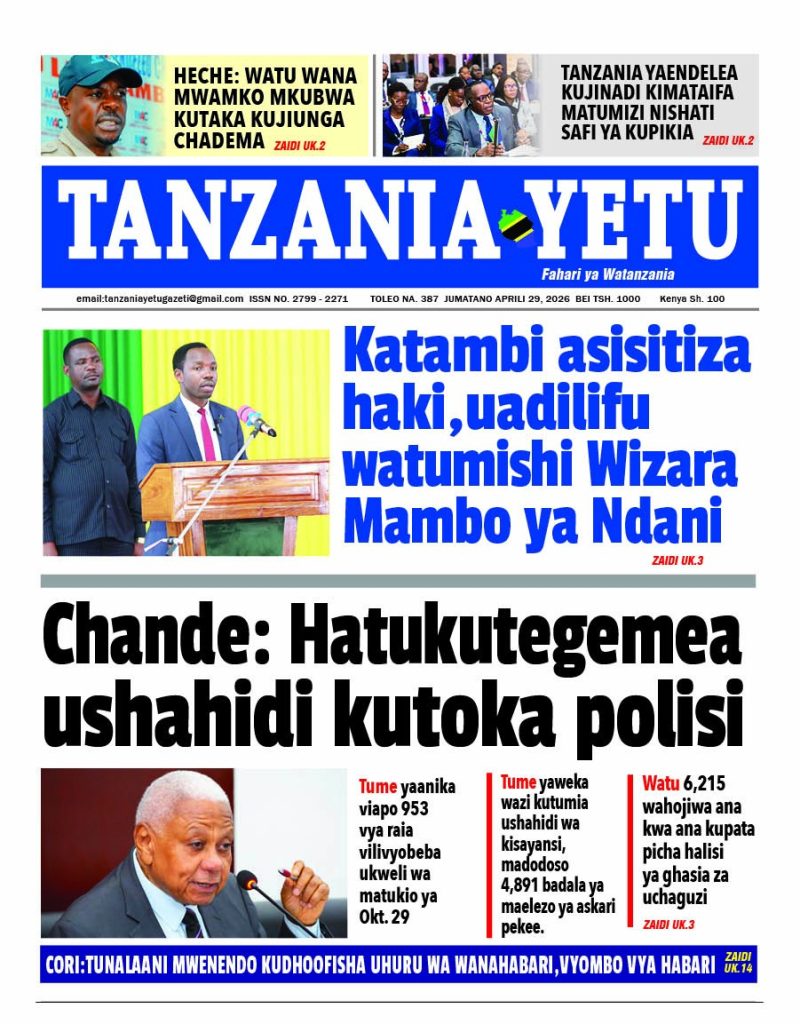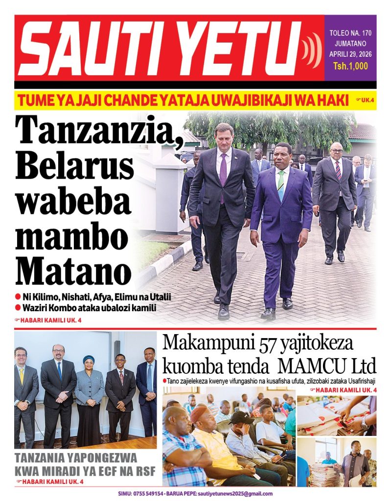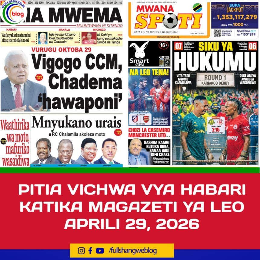 MagazetiPITIA VICHWA VYA HABARI KATIKA MAGAZETI YA LEO APRILI 29, 2026 Last updated: 2026/04/28 at 11:43 PM John Bukuku 3 hours ago Share SHARE John Bukuku April 28, 2026 April 28, 2026 Share this Article Facebook Twitter Email Print Previous Article PROF MUSHI: UPATIKANAJI WA MABASI YA WATUMISHI KUWEZESHA MAZINGIRA YA UTENDAJI Next Article MKURUGENZI JIJI LA ARUSHA AKABITHI MAGARI NA MFUMO WA MATANGAZO
