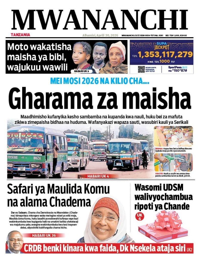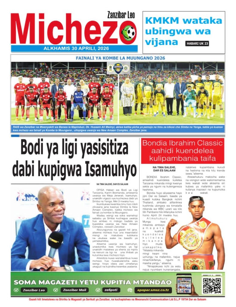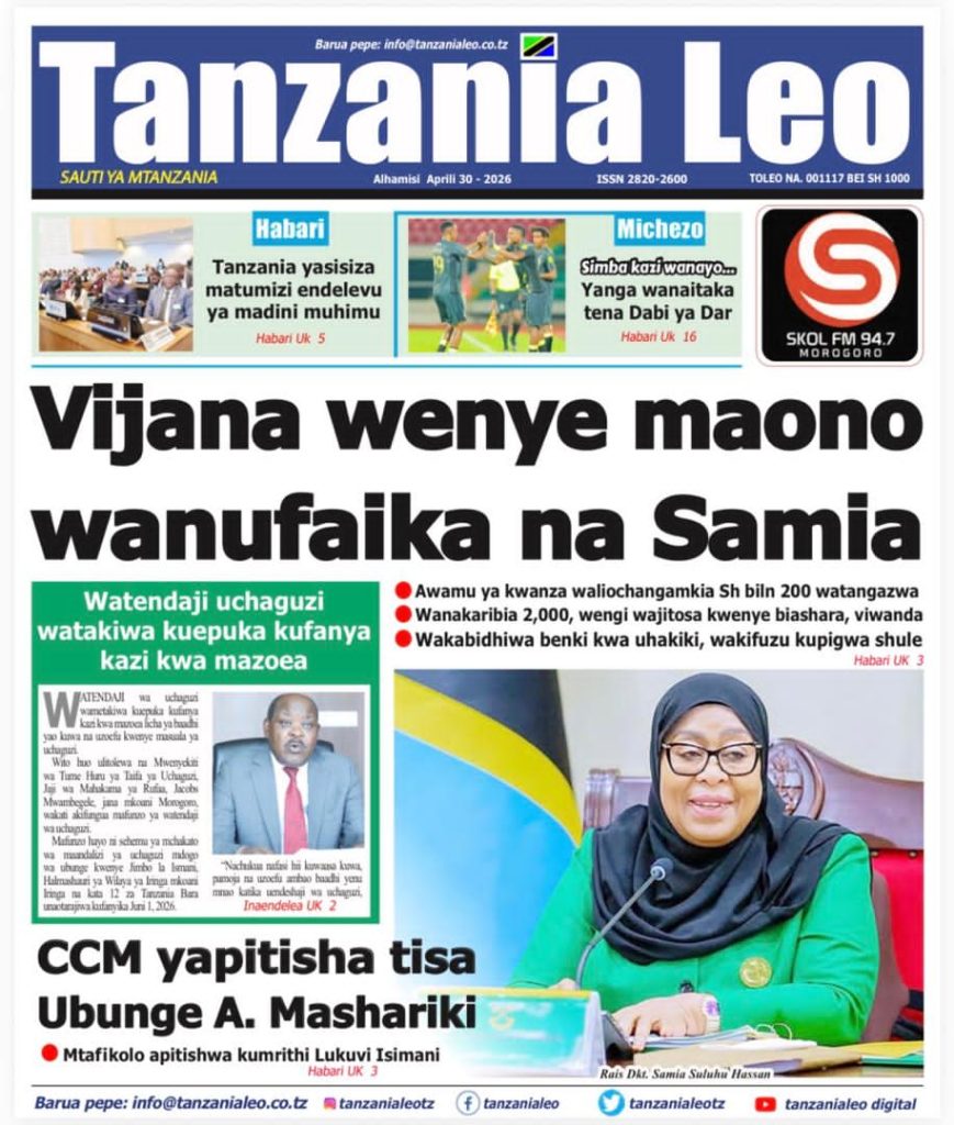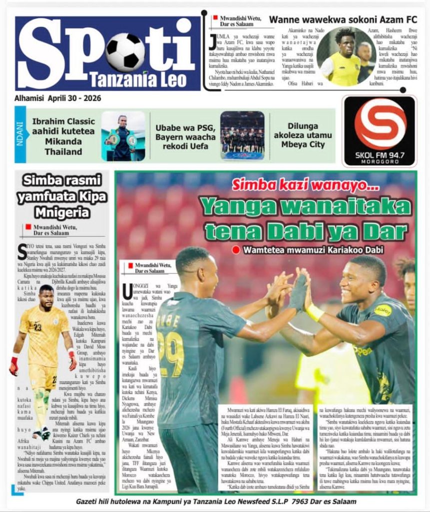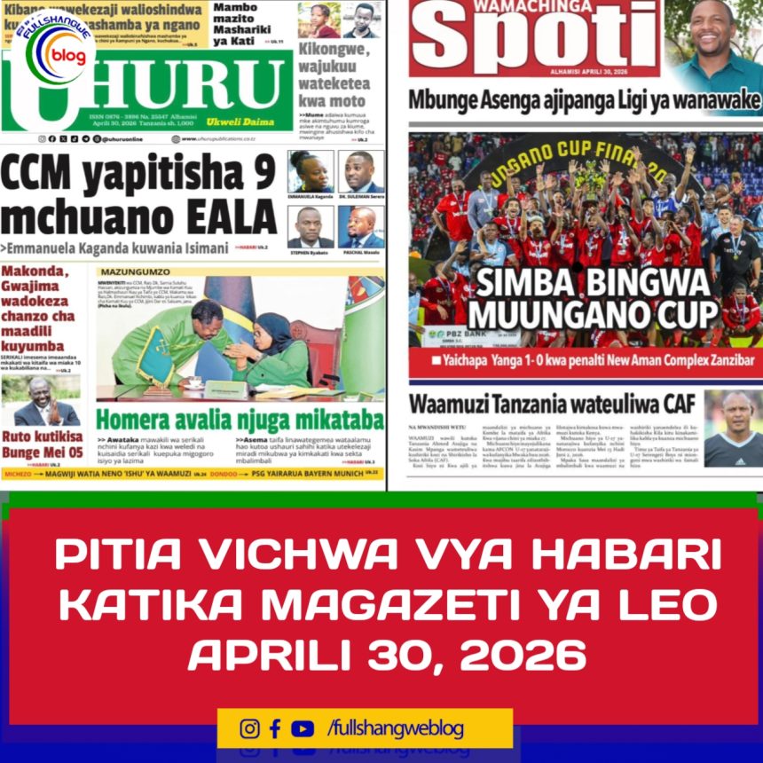 MagazetiPITIA VICHWA VYA HABARI KATIKA MAGAZETI YA LEO APRILI 30, 2026 Last updated: 2026/04/29 at 10:55 PM John Bukuku 34 minutes ago Share SHARE John Bukuku April 29, 2026 April 29, 2026 Share this Article Facebook Twitter Email Print Previous Article SIMBA SC YAIFANYA ‘VIBAYA’ YANGA FAINALI YA KOMBE LA MUUNGANO
