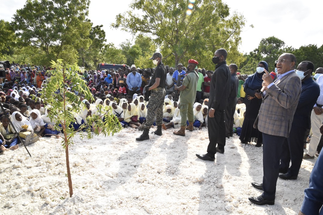 RAIS wa Zanzibar na Mwenyekiti wa Baraza la Mapinduzi Mhe.Dk.Hussein Ali Mwinyi akizungumza na Wananchi wa Kijiji cha Mbuyumaji Matemwe Mkoa wa Kaskazini Unguja, baada ya kukifungua Kituo cha Afya Mbuyumaji Matemwe, akiwa katika ziara yake Mkoa Kaskazini Unguja leo 5-7-2021.(Picha na Ikulu)