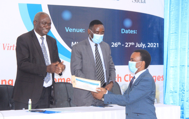 Makamu Mkuu wa Chuo cha Afya na Sayansi Shirikishi Muhimbili (MUHAS) Prof Andrea Pembe akikabidhi tuzo kwa Dr.Mark Mayala mshindi wa jumla wa machapisho ya kisayansi.