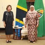Waziri wa Mambo ya Nje na Ushirikiano wa Afrika Mashariki, Balozi Liberata Mulamula akimueleza jambo Balozi wa Korea ya Kusini aliyemaliza muda wake wa uwakilishi hapa nchini Mhe. Tae-ick Cho katika Ofisi Ndogo za Wizara Jijini Dar es Salaam