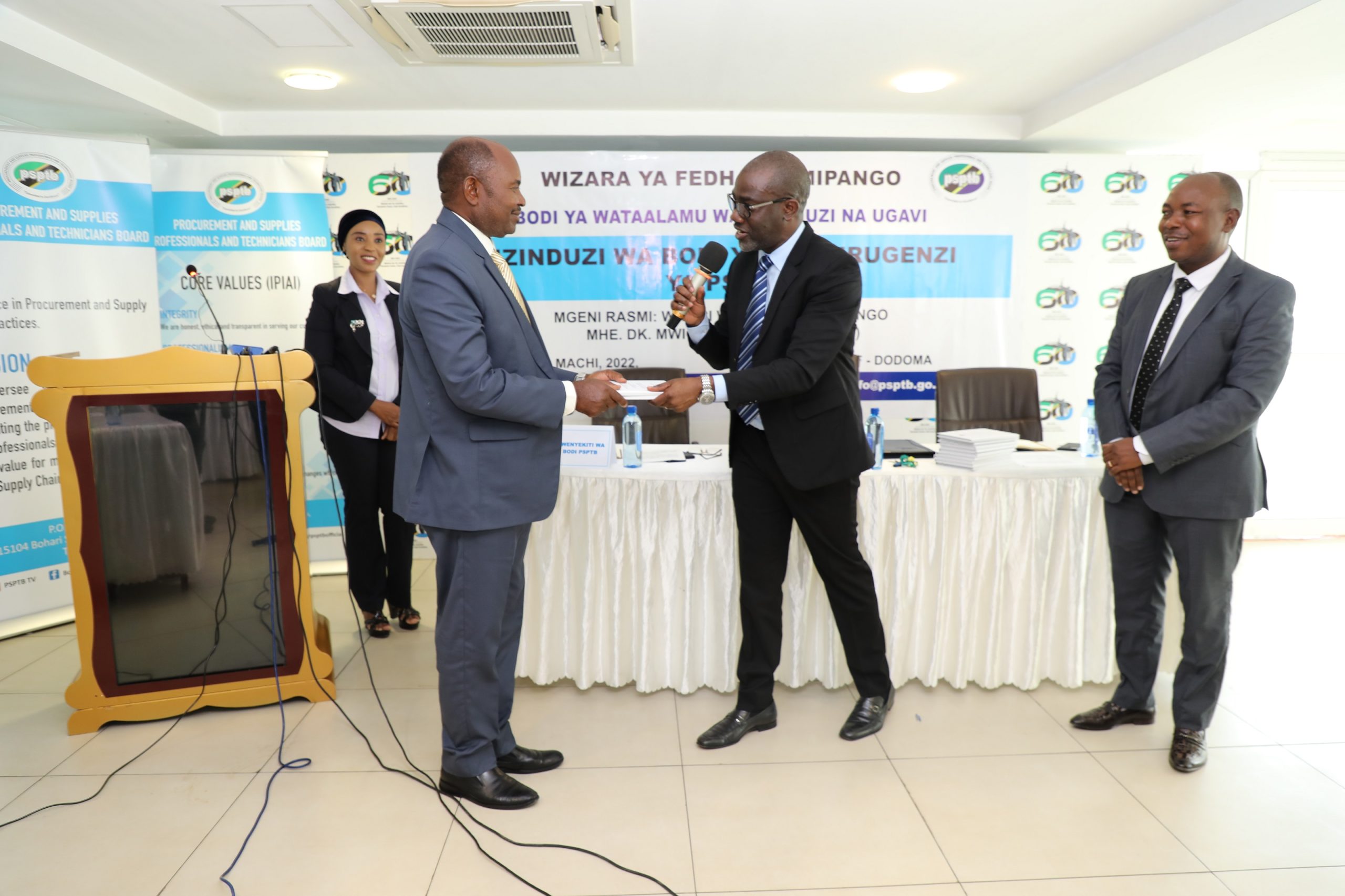 Naibu Katibu Mkuu Wizara ya Fedha na Mipango, Bw. Lawrance Mafuru (wa pili kulia) akimkabidhi mpangokazi Mwenyekiti wa Bodi ya Wakurugenzi ya Bodi ya Wataalamu wa Ununuzi na Ugavi (PSPTB), Bw. Jacob Kibona, baada ya kuzinduliwa kwa bodi hiyo jijini Dodoma. Kulia ni Mkurugenzi Mtendaji wa PSPTB Bw. Godfred Mbanyi, na kushoto ni Mkuu wa Kitengo cha Masoko na Uhusiano kwa Umma wa PSPTB Bi. Shamim Mdee.