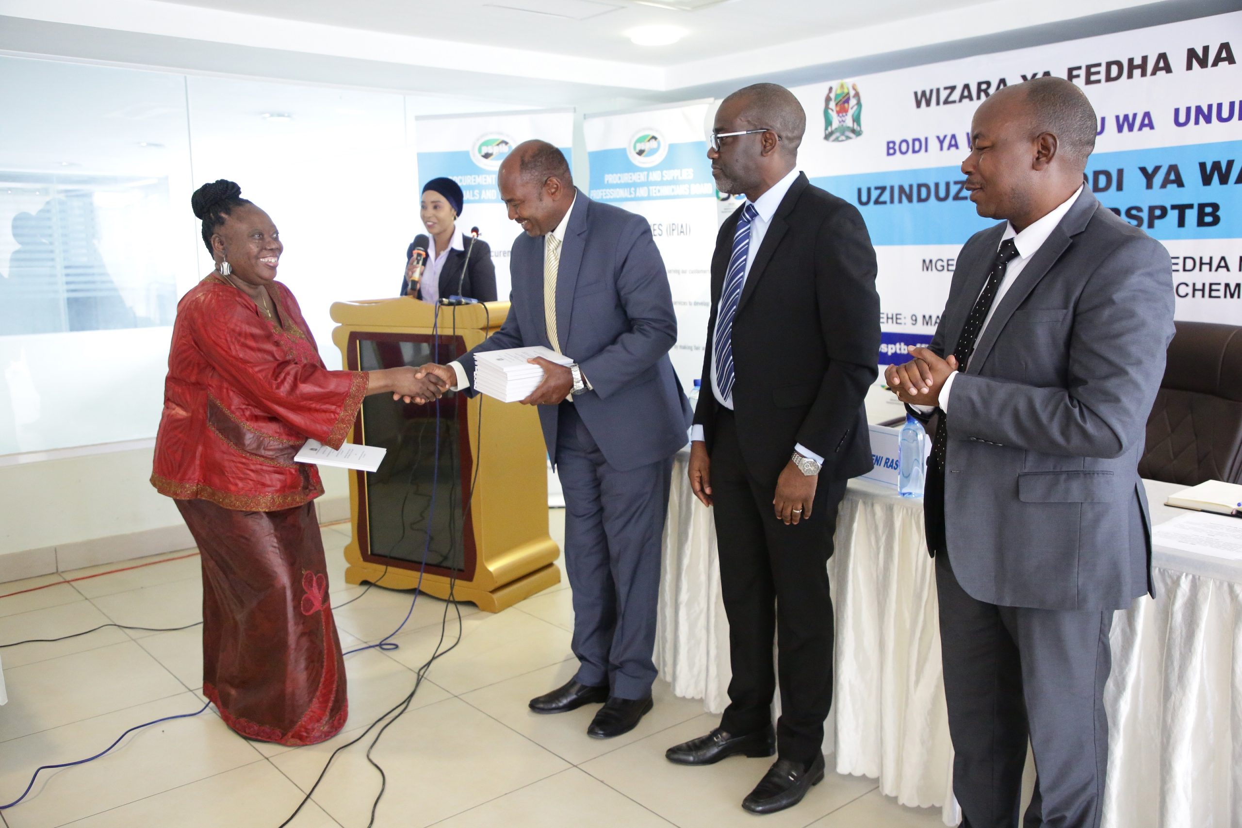 Mwenyekiti wa Bodi ya Wakurugenzi ya Bodi ya Wataalamu wa Ununuzi na Ugavi (PSPTB), Bw. Jacob Kibona, akimkabidhi mpango kazi mmoja wa wajumbe wa Bodi hiyo Bi. Esther Manyesha, mara baada ya kuzinduliwa kwa Bodi hiyo. Wa pili kulia ni Naibu Katibu Mkuu Wizara ya Fedha na Mipango Bw. Lawrance Mafuru, kushoto ni Mkurugenzi Mtendaji wa Bodi ya Wataalamu wa Ununuzi na Ugavi (PSPTB), Bw. Godfred Mbanyi na wa pili kushoto ni Mkuu wa Kitengo cha Masoko na Uhusiano kwa Umma wa Bodi hiyo Bi. Shamim Mdee.