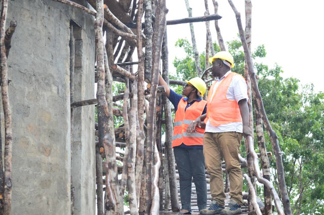Kaimu Meneja wa RUWASA wilaya ya Tunduru, Mhandisi Silvia Ndimbo, akitoa maelekezo kwa Mkandarasi wa Kampuni ya Ujenzi ya Civito, Mhandisi Stanley Mlelwa kuhusu ujenzi wa tenki la maji la Daraja Mbili wilayani hapo.