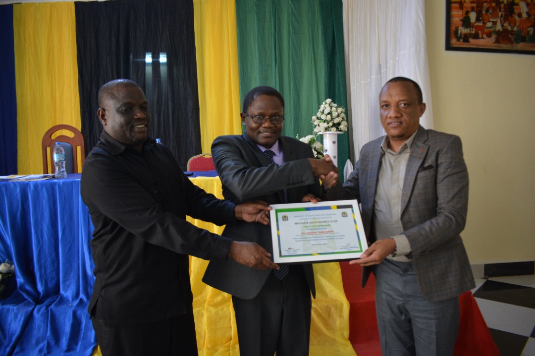 Katibu Mkuu Wizara ya Mifugo na Uvuvi (Uvuvi), Dkt. Rashid Tamatamah (katikati) akipokea Cheti cha shukrani kutoka kwa Mwenyekiti wa Klabu ya Michezo, Bw. Ally Suru (kulia) ikiwa ni ishara ya kutambua mchango wake katika kuendeleza na kuthamini shughuli za michezo. Kushoto ni Mkurugenzi wa Idara ya Utawala na Rasilimali Watu, Bw. Amosi Machilika.
