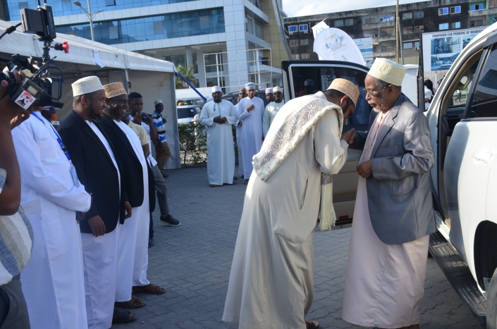 Mufti Mkuu wa Zanzibar Sheikh Saleh Omar Kabi akiwasili katika Viwanja vya Mnara wa Kumbukumbu Kisonge kwa ajili Ufunguzi wa Maonesho ya Kiislamu katika Tamasha la Maulid na kupokelewa na Masheikh mbalimbali Zanzibar.