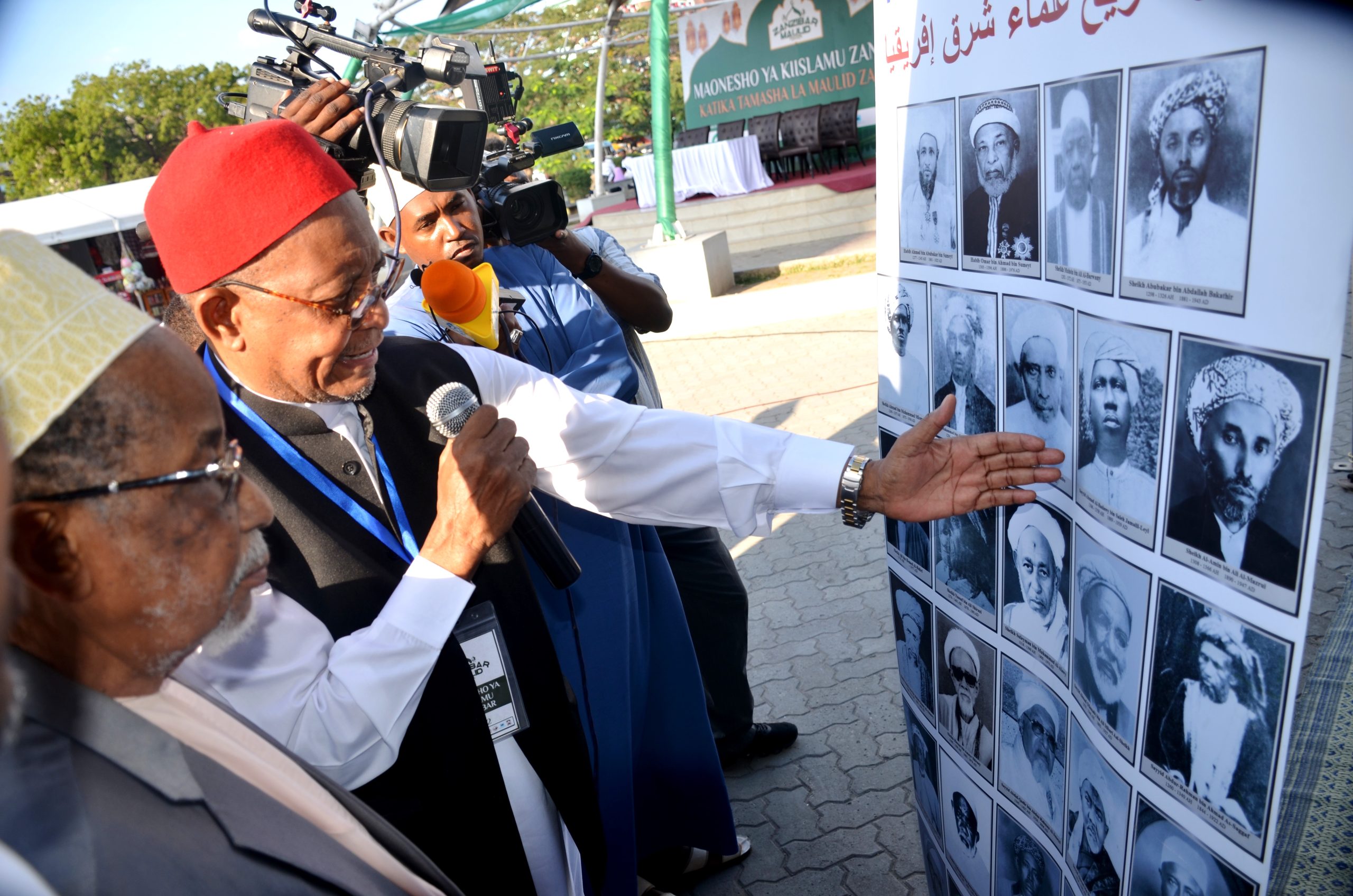 Mufti Mkuu wa Zanzibar Sheikh Saleh Omar Kabi (wakwanza kushoto)akipata maelezo kutoka kwa Mkurugenzi wa Kituo cha Markazi ya Mkunazini Maalim Hamza Zubeir kuhusiana na Taarekh na Histaria ya wanavyuoni wa Afrika Mashariki wakati alipotembelea Banda hilo katika hafla ya ufunguzi wa Maonesho ya Kiislamu katika Tamasha la Maulid Mnara wa kumbukumbu Kisonge Jjini Zanzibar.