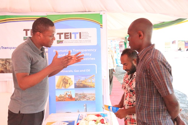 Mtaalam kutoka Taasisi ya Uhamasishaji Uwazi na Uwajibikaji katika Rasilimali Madini, Mafuta na Gesi Asilia (TEITI) Erick Ketagory (kushoto) akielezea majukumu ya TEITI kwa wadau waliotembelea banda la Wizara ya Madini katika Maonesho ya Teknolojia na Uwekezaji wa Madini yaliyofanyika mjini Geita tarehe 24 Septemba, 2019.