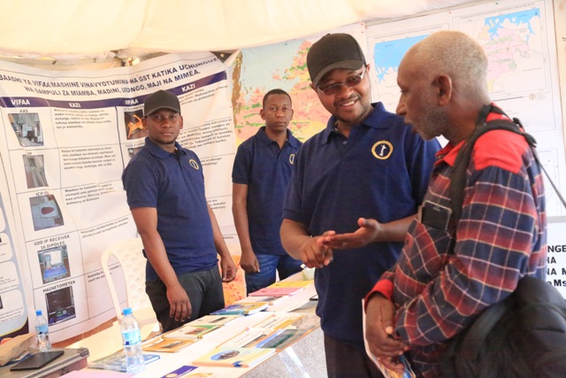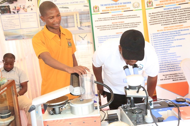 Mtaalam kutoka Kituo cha Jimolojia Tanzania (TGC), Cleophas Siame (kushoto) akimwelekeza mmoja wa watembeleaji wa banda hilo namna ya kuangalia ubora wa madini kwa kutumia darubini katika Maonesho ya Teknolojia na Uwekezaji wa Madini yaliyofanyika mjini Geita tarehe 24 Septemba, 2019.