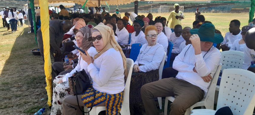 Baadhi ya watu wenye ualbino wakiwa katika uwanja wa Majimaji mjini Songea katika maadhimisho ya kimataifa ya siku ya uelewa kuhusu ualbino ambapo wawakilishi kutoka mikoa yote nchini wameshiriki kwenye maadhimisho hayo ambayo mgeni rasmi alikuwa ni Waziri wa Nchi Ofisi ya Waziri Mkuu,,Kazi,Vijana,ajira na watu wenye ulemavu Profesa Joyce Ndalichako.