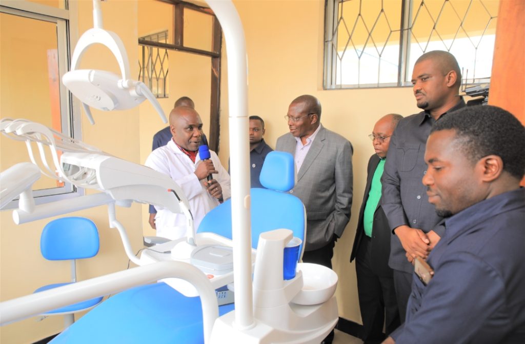 Makamu wa Rais wa Jamhuri ya Muungano wa Tanzania Mhe. Dkt Philip Isdor Mpango akipewa maelezo ya namna mashine ya kutolea huduma ya kinywa na meno inavyofanya kazi wakati akikagua vifaa tiba vilivyopo katika kituo cha afya Lilambo kabla ya kukizindua kituo hicho, kilichojengwa katika Kijiji cha Kigonsera.