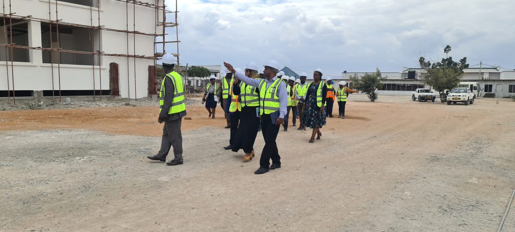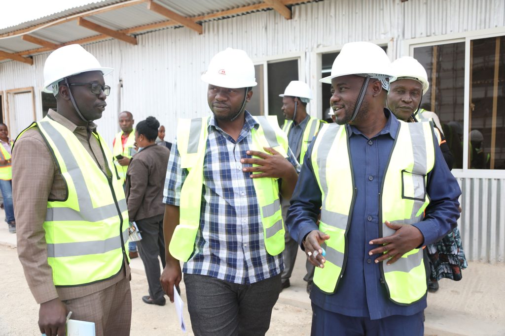 Msimamizi wa mradi wa jengo la Ofisi la Wizara ya Ujenzi na Uchukuzi kutoka Sekta ya Ujenzi, Eng. Paul Luhala, akiongoza menejimenti ya Sekta hiyo katika ukaguzi wa jengo hilo ambalo limefikia asilimia 68, eneo la Mtumba, jijini Dodoma.