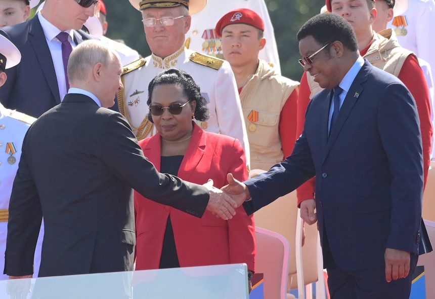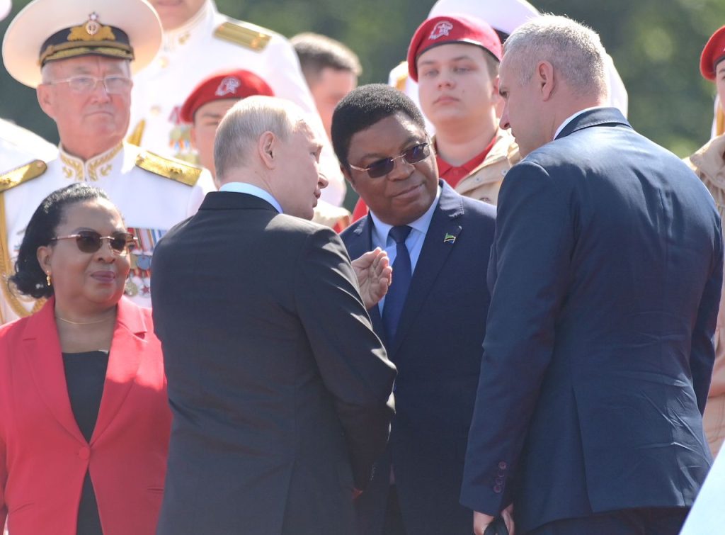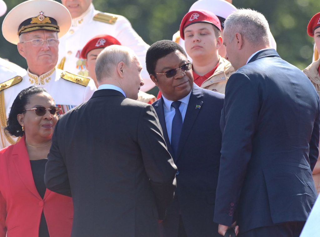 Waziri Mkuu, Kassim Majaliwa akizungumza na Rais wa Urusi, Vladimir Putin wakati alipohudhuri gwaride la Jeshi la Wanamaji la nchi hiyo lililofanyika St. Petersburg nchini Urusi, Julai 30, 2023. Kushoto ni mkewe Mama Mary Majaliwa.