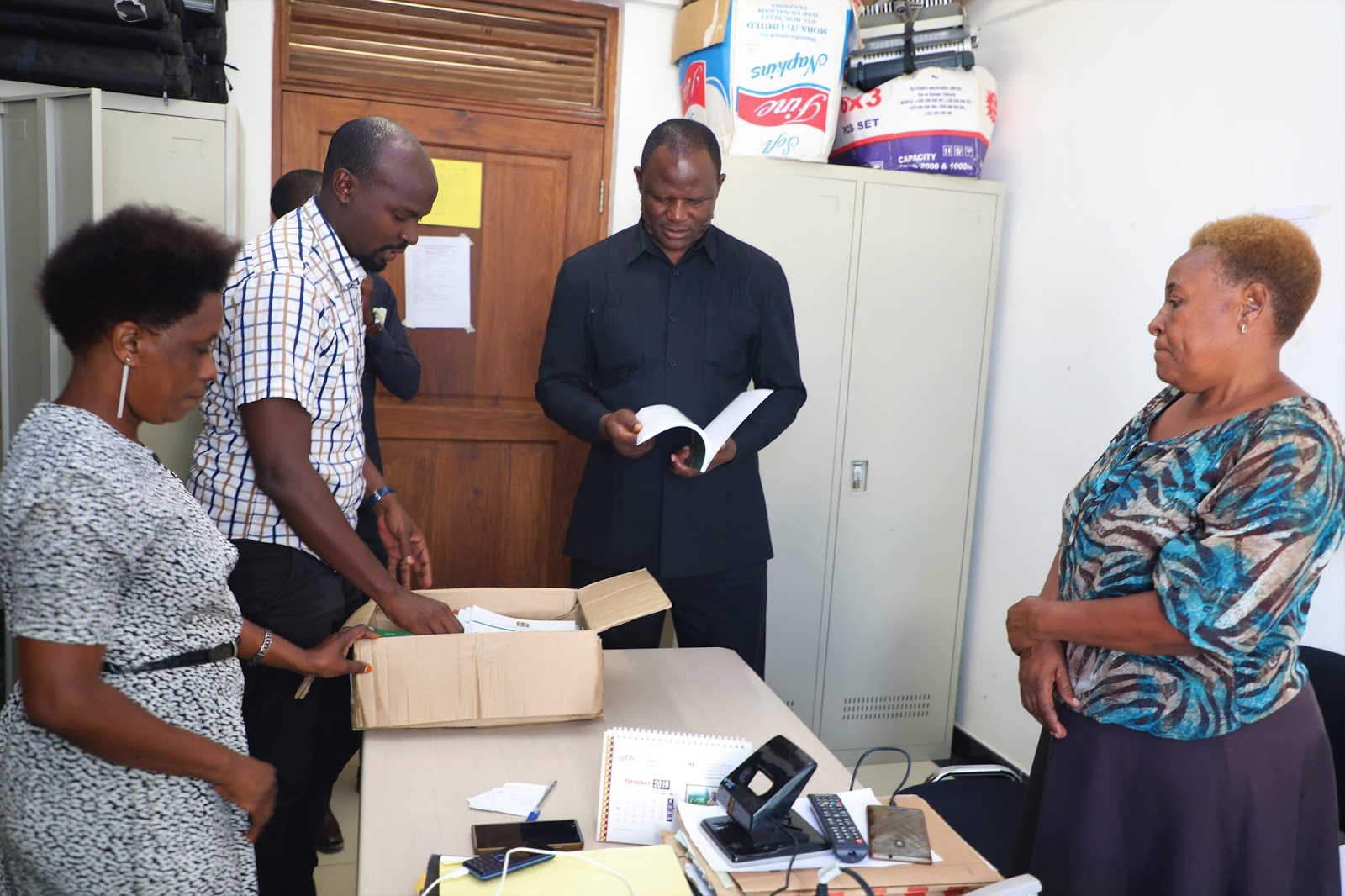 Waziri wa Kilimo Mhe Japhet Hasunga (Mb) akikagua kitabu cha muongozo wa kilimo kinachohimili mabadiliko ya tabianchi alipotembelea kitengo cha mazingira wakati akizungumza na watumishi Jijini Dodoma alipotembelea ofisi za wizara hiyo eneo la Chuo Kikuu cha Dodoma (UDOM) leo tarehe 30 Octoba 2019. (Picha Na Mathias Canal, Wizara ya Kilimo)