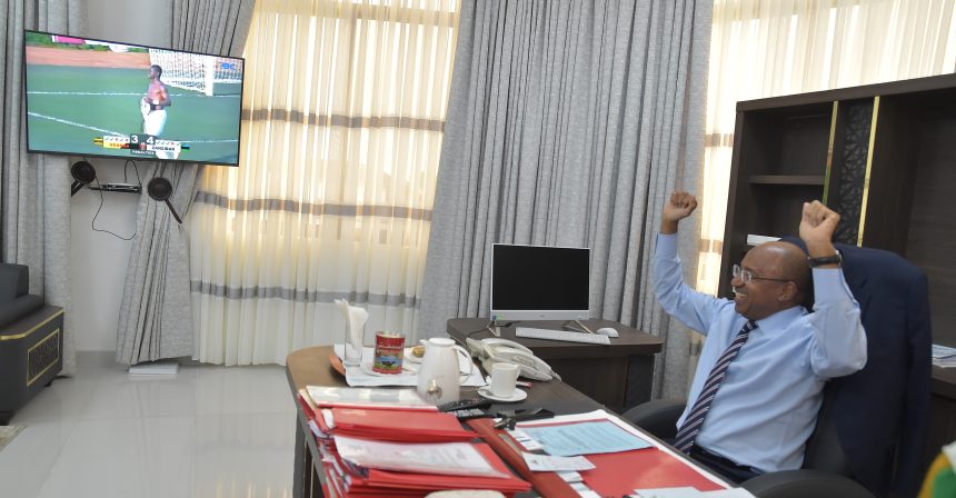 RAIS wa Zanzibar na Mwenyekiti wa Baraza la Mapinduzi Mhe.Dk.Hussein Ali Mwinyi akishangilia bao la nne la mkwaju wa penenti lililofungwa na mchezaji laqman Othman lililoipa Ubingwa wa wa Kombe la CECAFA U-15. Timu ya Taifa ya Zanzibar Karume Boys chini ya Umiri wa miaka 15, katika mchezo wa fainali dhidi ya Timu ya Uganda, akifuatilia mchezo wa fainali hiyo akiwa Ofisini kwake Ikulu Jijini Zanzibar. Timu ya Taifa ya Zanzibar Karume Boys imshinda mchezo huo kwa penenti 4-3.(Picha na Ikulu)
