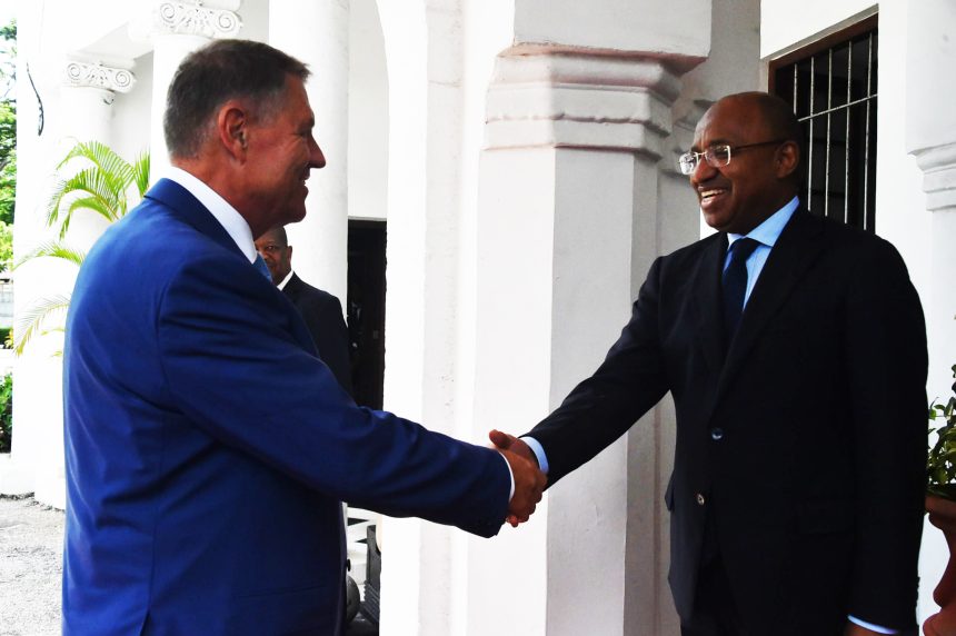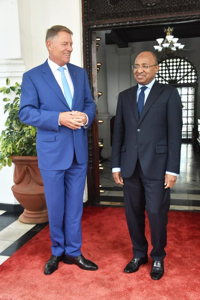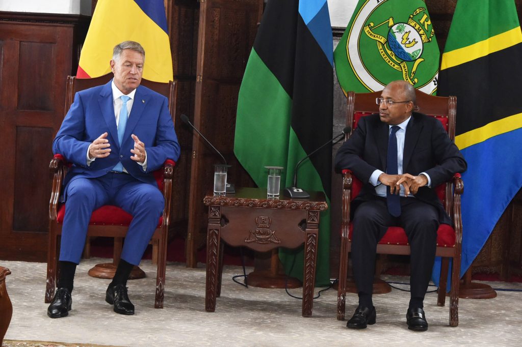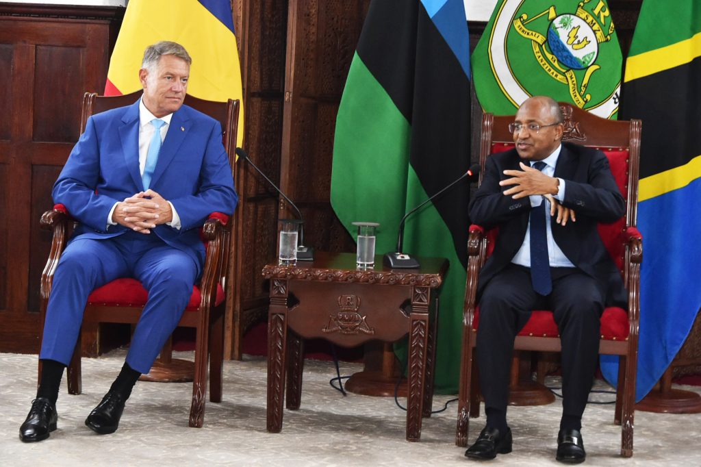 Rais wa Zanzibar na Mwenyekiti wa Baraza la Mapinduzi Mhe.Dk.Hussein Ali Mwinyi (kulia) akiwa na mgeni wake Rais wa Romania Mhe.Klaus Iohannis baada ya kuwasili Ikulu Jijini Zanzibar leoakiwa katika ziara ya siku nne nchini.
