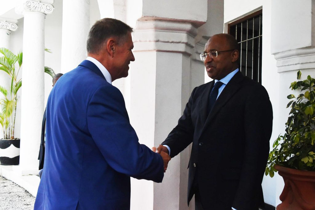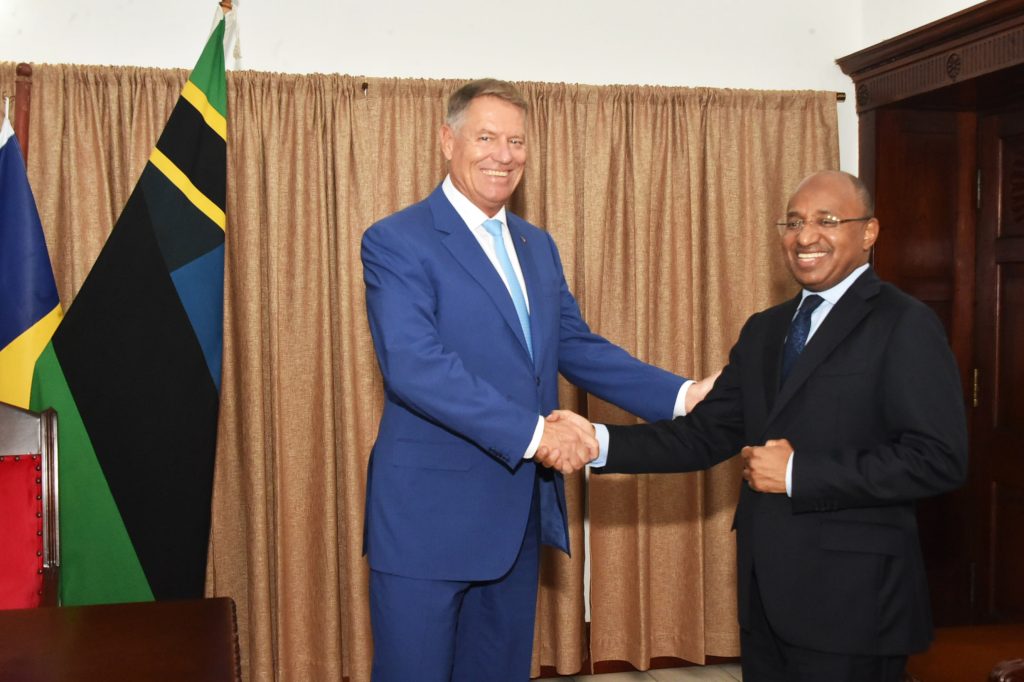 Rais wa Zanzibar na Mwenyekiti wa Baraza la Mapinduzi Mhe.Dk.Hussein Ali Mwinyi (kulia) akimkaribisha Mgeni wake Rais wa Romania Mhe.Klaus Iohannis baada ya kuwasili Ikulu Jijini Zanzibar leoakiwa katika ziara ya siku nne nchini.