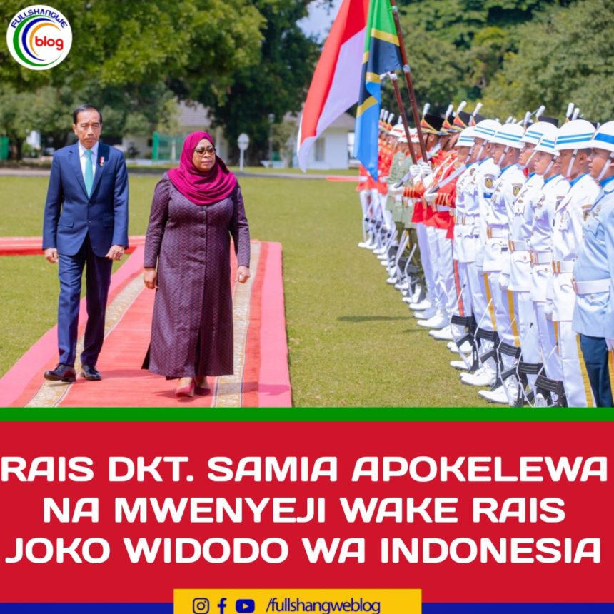Rais wa Jamhuri ya Muungano wa Tanzania Mhe. Samia Suluhu Hassan akiwa amesimama na Mwenyeji wake Rais wa Jamhuri ya Indonesia Mhe. Joko Widodo wakiangalia Vikosi vya Gwaride la Heshima vikipita mbele wakati wa Mapokezi Rasmi yaliyofanyika kwenye viwanja vya Bogor Presidential Palace tarehe 25 Januari, 2024.