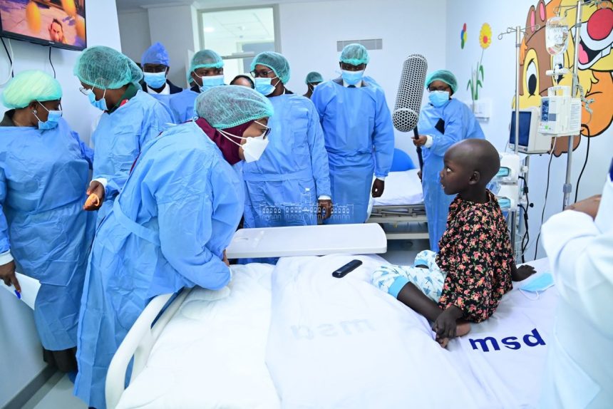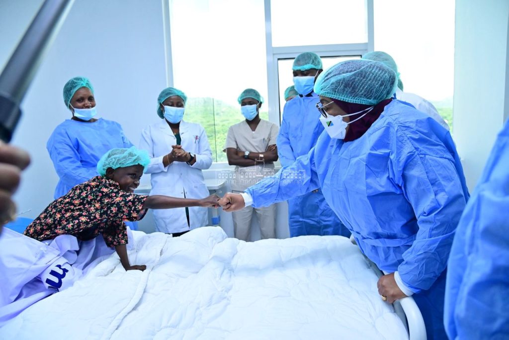Rais wa Jamhuri ya Muungano wa Tanzania Mhe. Samia Suluhu Hassan akimjulia hali Laurean Kanaganwa ambaye bado hajapandikizwa uloto katika Hospitali ya Rufaa ya Kanda ya Kati ya Benjamin Mkapa Jijini Dodoma tarehe 01 Februari, 2024