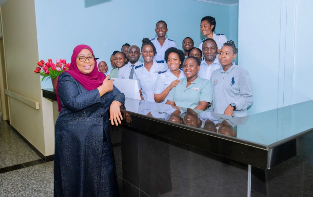 Rais wa Jamhuri ya Muungano wa Tanzania Mhe. Samia Suluhu Hassan akiwa kwenye picha ya pamoja na Wauguzi wa hospitali ya Benjamin Mkapa jijini Dodoma mara baada ya kutembelea hospitali hiyo leo, Februari 1, 2024.
