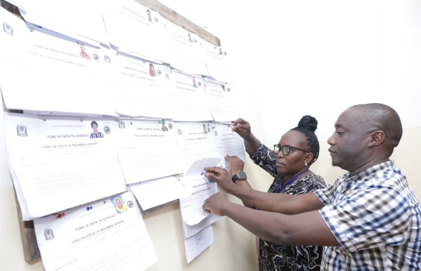 Wasimamizi Wasaidizi wa Uchaguzi Kata ya Kimbiji, Bw. Ricky Pascal na Bi. Twidike Ntwima wakibandika fomu za utezi wa wagombea wa udiwani Kata ya Kimbiji leo baada ya muda wa uteuzi kumalika Saa 10:00 jioni ya Machi 4,2024. Wagombea 14 waliochukua fomu wameteuliwa kuwania nafasi hiyo.