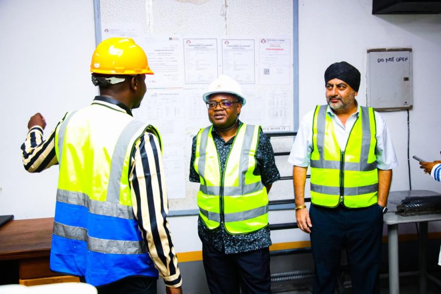 Waziri wa Nchi, Ofisi ya Rais, Mipango na Uwekezaji Mhe. Prof.Kitila Mkumbo (katikati), Na Bi. Khadija Nassir, Mkuu wa Wilaya ya Mkuranga wakipokea maelezo kutoka kwa Bw. Sailesh Pundit mmoja wa wasimamizi wa kiwanda cha Lodhia, alipotembelea kiwanda hicho kilichopo Mkuranga mkoani Pwani.