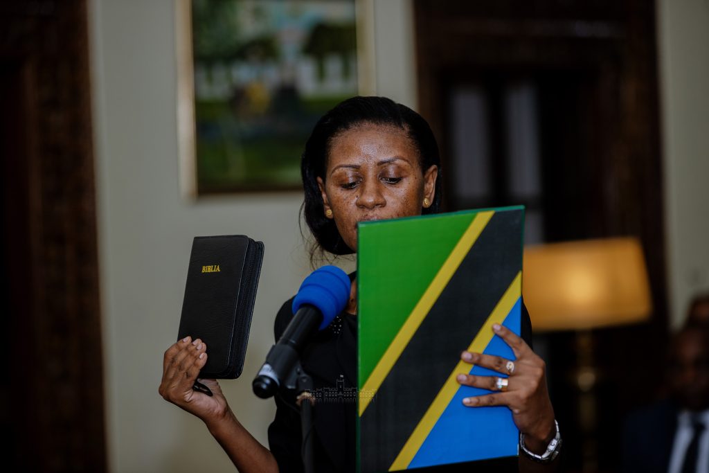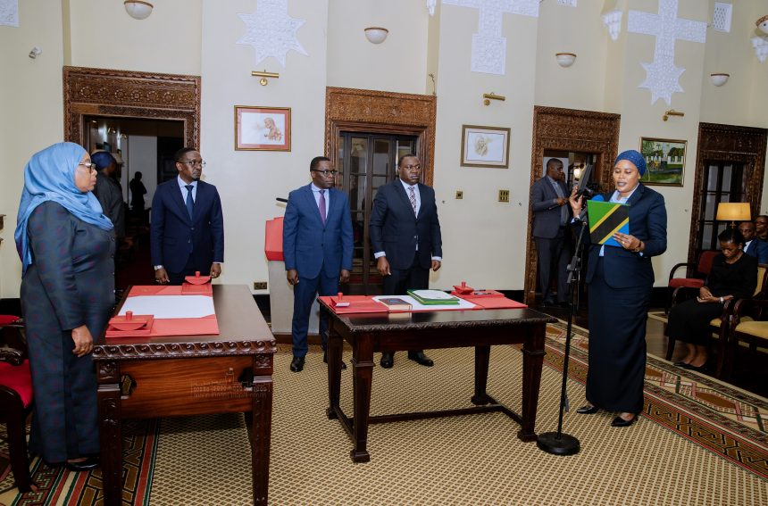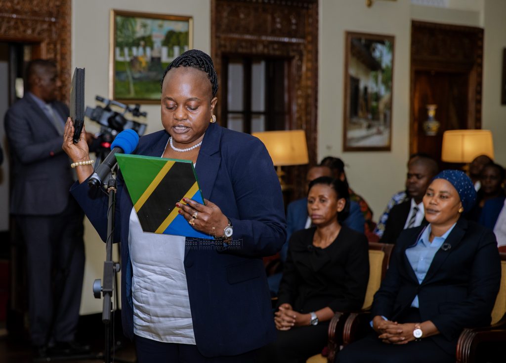Rais wa Jamhuri ya Muungano wa Tanzania Mhe. Samia Suluhu Hassan, akimuapisha Ndugu Alice Edward Mtulo kuwa Naibu Wakili Mkuu wa Serikali katika hafla fupi iliyofanyika Ikulu Jijini Dar es Salaam tarehe 28 Aprili, 2024.