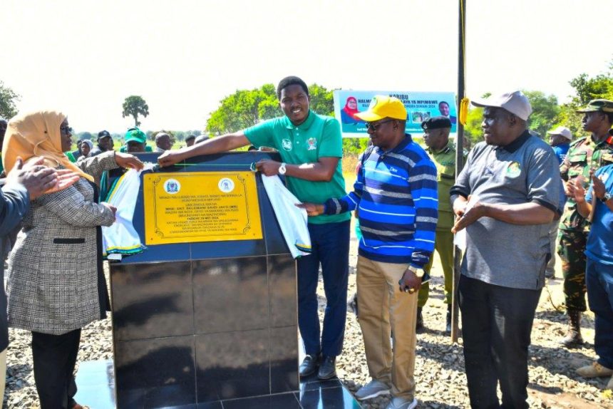 Waziri wa nchi Ofisi ya Makamu wa Rais (Muungano na Mazingira) Mhe. Suleiman Jafo akizindua mradi wa Josho, Banio na Birika la kunyweshea mifugo katika mradi wa urejeshwaji endelevu wa mazingira na uhifadhi wa Bioanuai Tanzania (SLR) unaosimamiwa na Ofisi ya Makamu wa Rais katika kata ya Kasansa halmashauri ya Mpimbwe mkoa wa Katavi tarehe 29 Mei 2024. Wa pili kulia ni Naibu Waziri wa Ardhi Nyumba na Maendeleo ya Makazi na Mbunge wa jimbo la Kavuu Mhe. Geophrey Pinda.