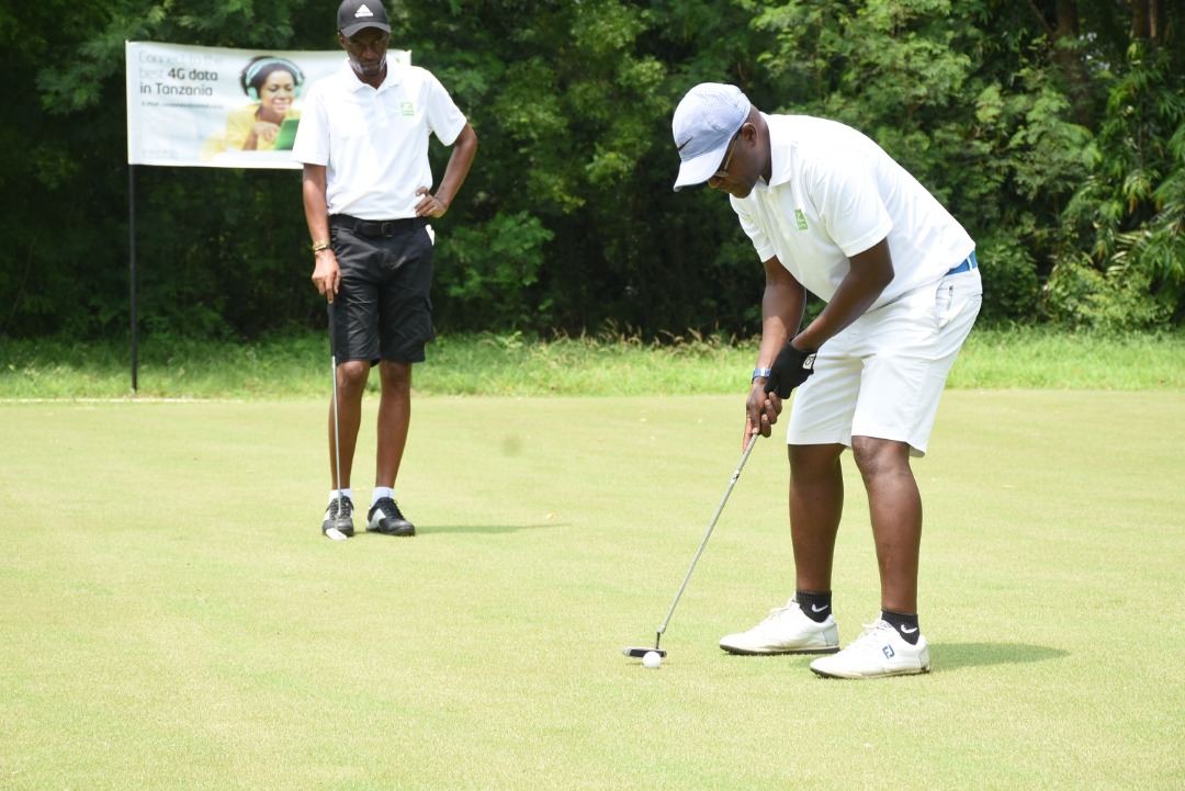mcheza Golf ya Stephen Chuwalo, wa Lugalo akicheza wakati wa Mashindano ya Ndani ya Mwezi yaliyofanyika katika Viwanja vya Lugalo Jijini Dar es Salaam na kudhaminiwa na Zantel anayemtazama ni mchezaji mwenzie,Nathan Mpangala. Picha na luteni Selemani Semunyu.