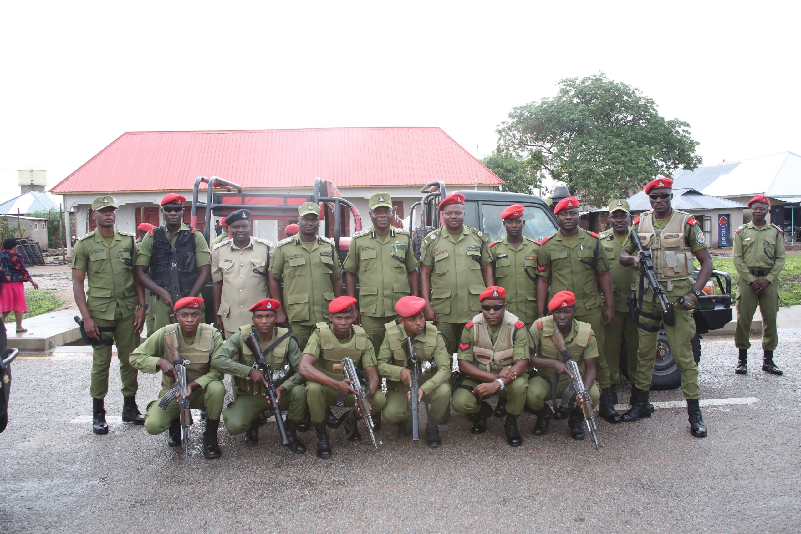 Mkuu wa Jeshi la Polisi Nchini IGP Simon Sirro, akiwa katika picha ya pamoja na Kamanda wa Polisi mkoa wa Simiyu, ACP William Mkonda na askari wa Kikosi cha Kutuliza Ghasia mkoani humo wakati akiwa safarini kuelekea mkoani Dodoma. Picha na Jeshi la Polisi.