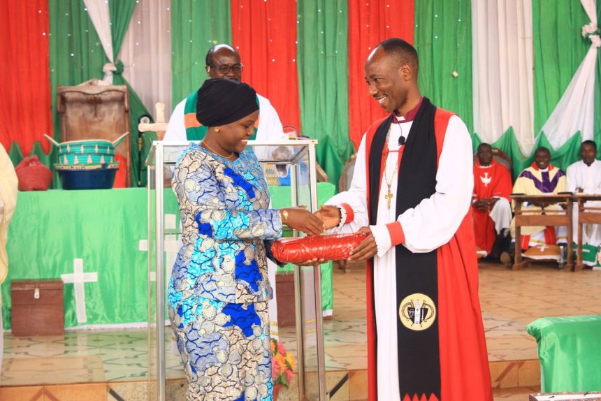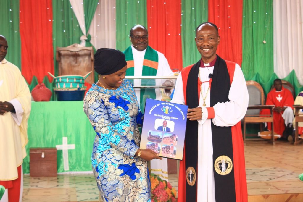 Naibu Waziri, Ofisi ya Rais-TAMISEMI (Elimu) Mhe. Zainab Katimba akipokea zawadi yake kutoka kwa Baba Askofu Emanuel Charles Bwata wa Kanisa Kuu la Andrea Mtakatifu la Uaskofu la Anglican wakati wa ibada ya harambee maalumu ya ujenzi wa kanisa hilo lililopo Kasulu Dayosisi ya Western Tanganyika.