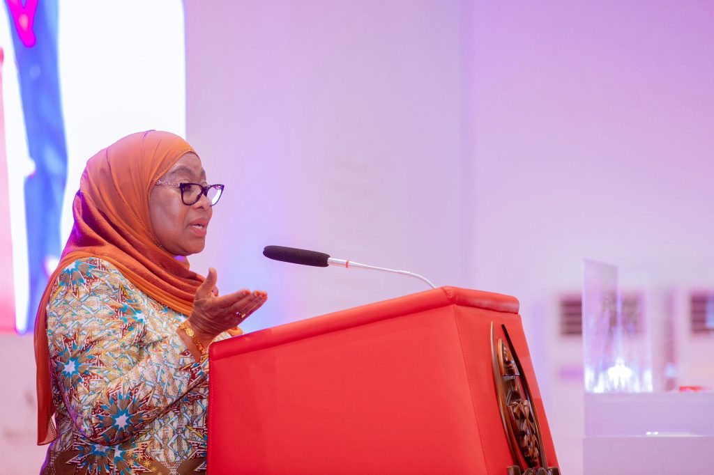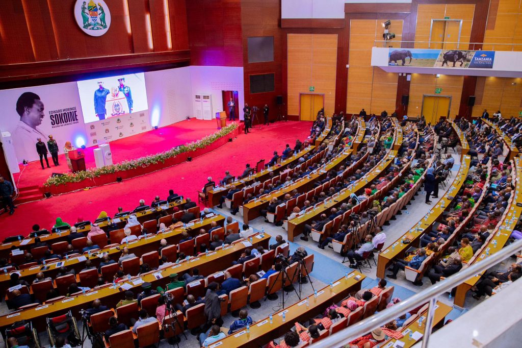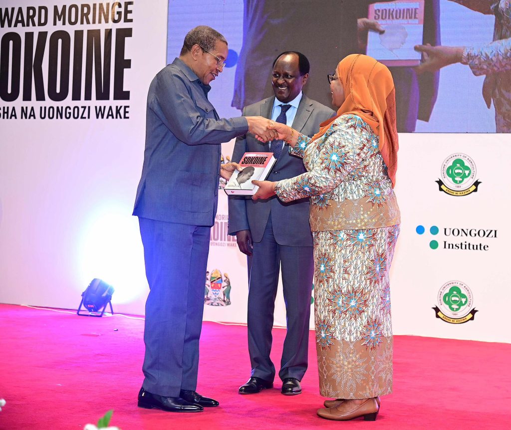 Rais wa Jamhuri ya Muungano wa Tanzania Mhe. Dkt. Samia Suluhu Hassan akimkabidhi Makamu wa Rais. Mhe. Philip Isdor Mpango Kitabu pamoja na Viongozi wengine waliohudhiria uzinduzi wa Kitabu kuhusu Maisha na Uongozi wa Hayati Edward Moringe Sokoine, aliyekuwa Waziri Mkuu wa Jamhuri ya Muungano wa Tanzania mwaka 1977 mpaka 1980 na 1983 mpaka 1984 katika Kituo cha Mikutano cha Kimataifa cha Julius Nyerere (JNICC) leo tarehe 30 Septemba, 2024.