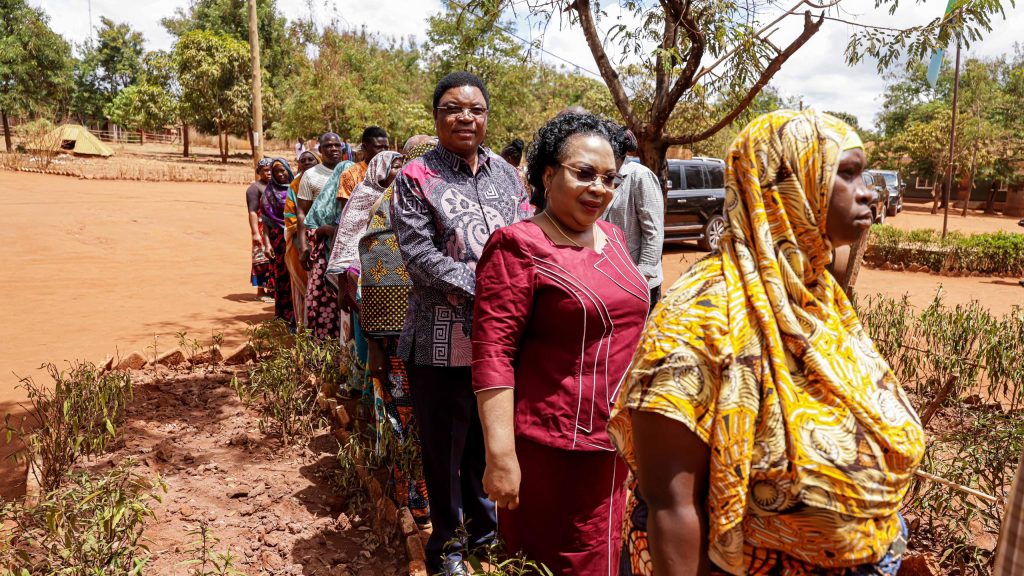 Waziri Mkuu Kassim Majaliwa na Mkewe Mary Majaliwa wakiwa katika foleni ya kupiga Kura kwenye kituo cha Shule ya Msingi Nandagala, Ruangwa Mkoani Lindi, kuchagua viongozi wa Serikali za Mitaa, Vijiji na Vitongoji Novemba 27, 2024. (Picha na Ofisi ya Waziri Mkuu)