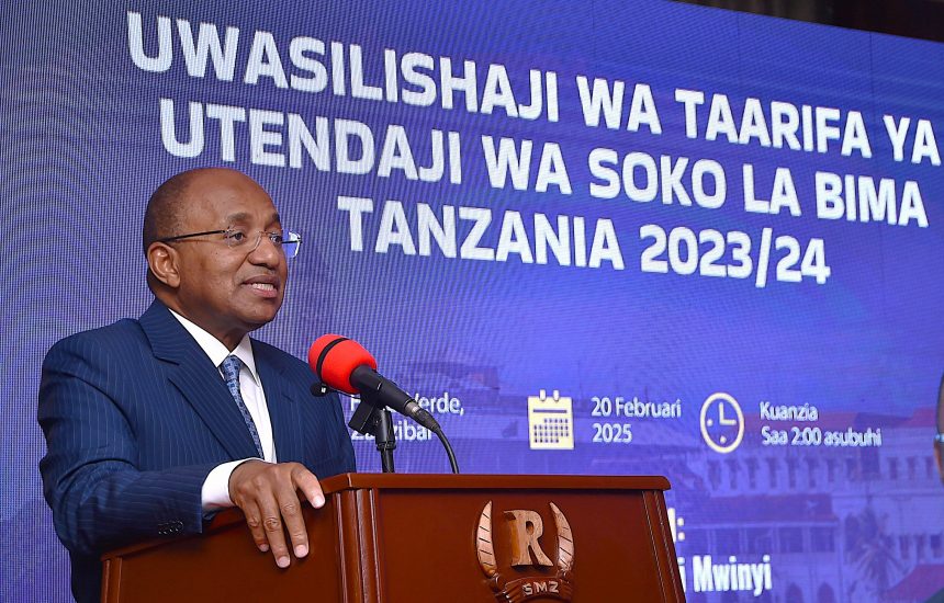 RAIS wa Zanzibar na Mwenyekiti wa Baraza la Mapinduzi Mhe.Dk.Hussein Ali Mwinyi akikabidhiwa Taarifa ya Utendaji wa Soko la Bima Tanzania, akikabidhiwa na Makamu Mwenyekiti wa Bodi ya Bima Tanzania Dr. Suleiman Rashid Mohamed, baada ya kuwasilisha katika mkutano wa Wadau wa Bima Tanzania, uliyofanyika katika ukumbi wa Hoteli ya Verde Mtoni Jijini Zanzibar leo 20-2-2025 na (kulia kwake) Waziri wa Nchi Afisi ya Rais Fedha na Mipango Zanzibar Dkt. Saada Mkuya Salum.(Picha na Ikulu)