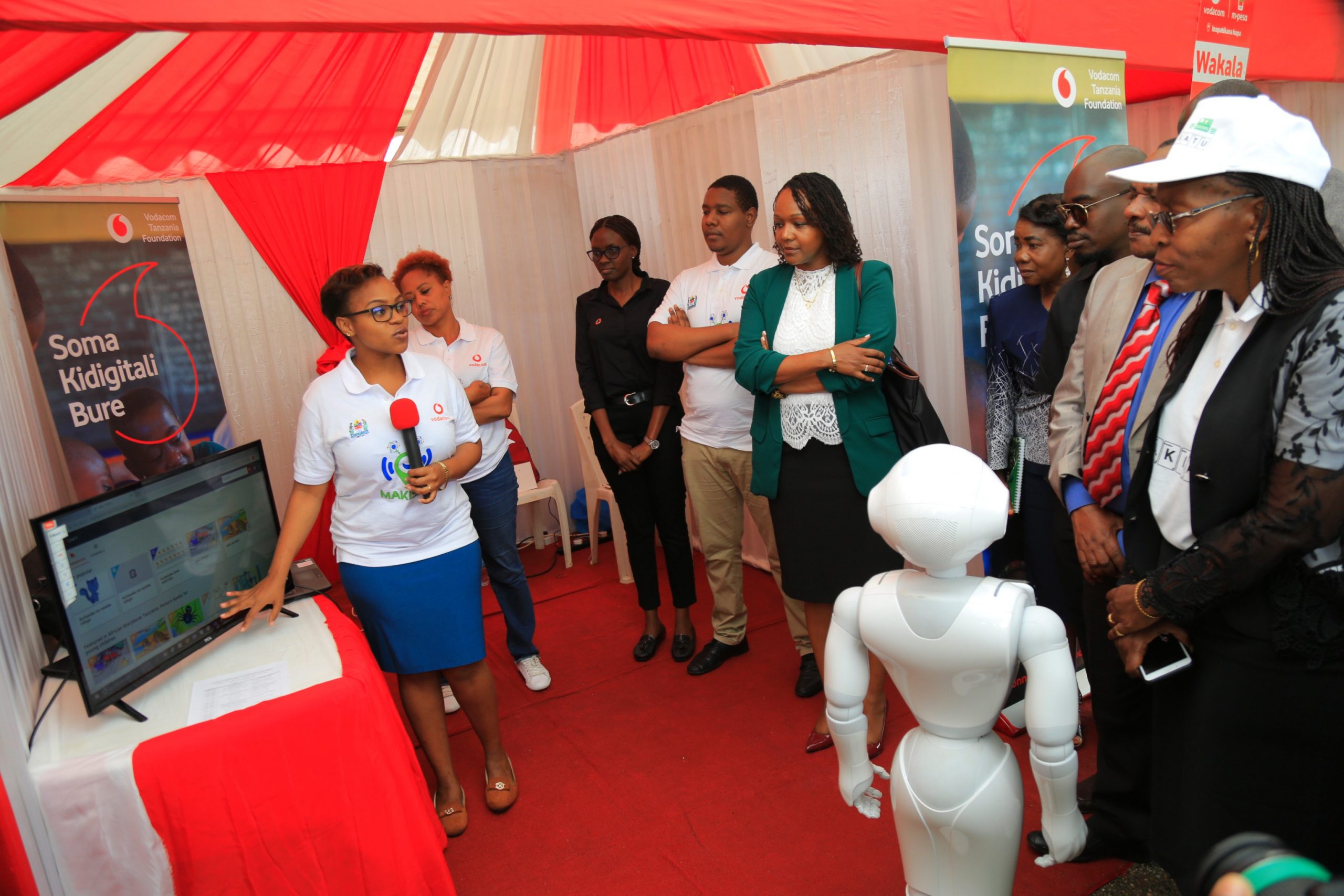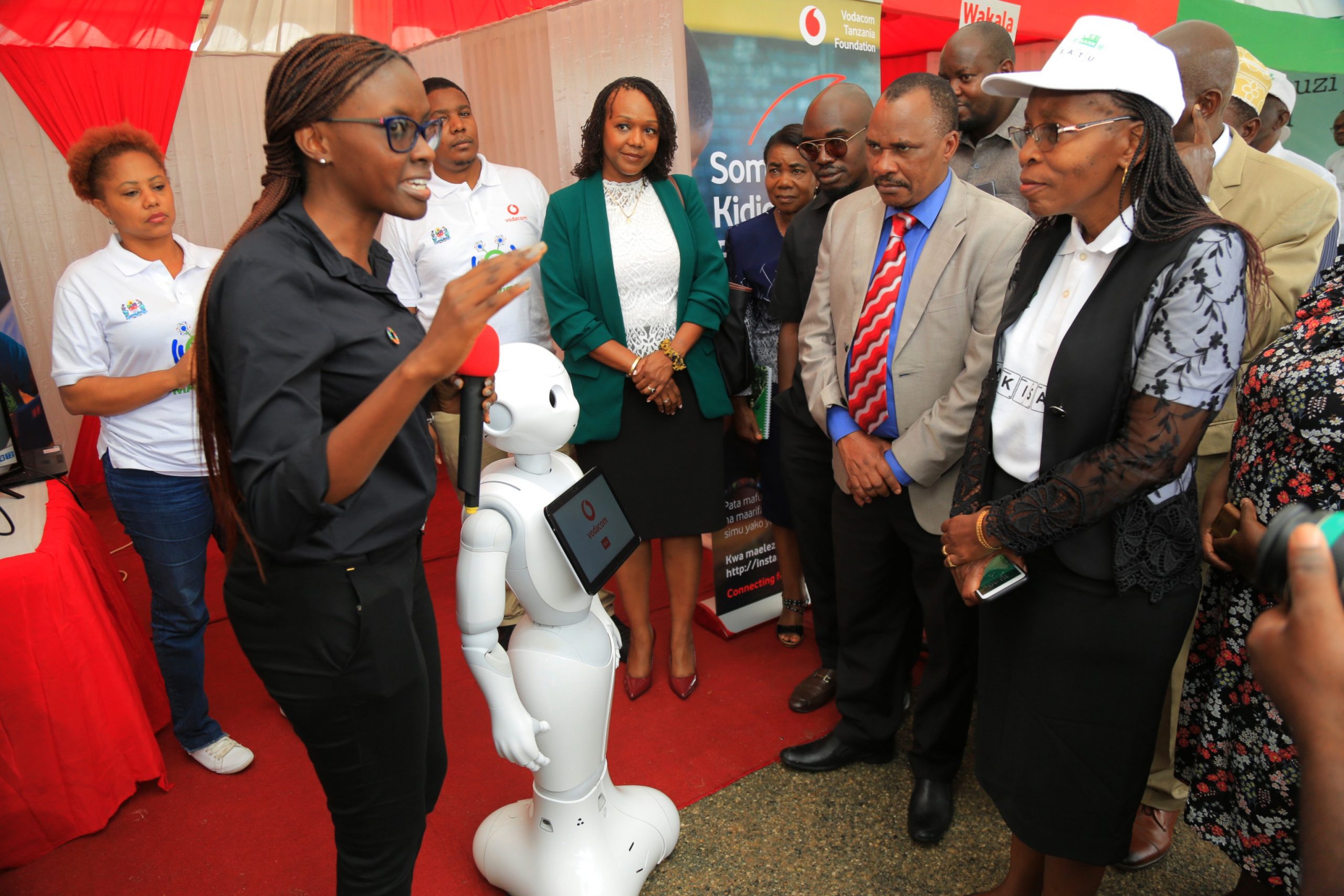 Mkuu wa kitengo cha mawasiliano Kampuni ya simu ya Vodacom Tanzania ,Jacquiline Materu (kushoto) akimpa maelezo Naibu Katibu Mkuu Wizara ya Elimu,Sayansi na Teknolojia ,Dk.Avemaria Semakafu (kulia) na msafara wake kuhusu kazi anazofanya roboti ajulikanaye kwa jina la Pepper ndani ya banda la kampuni hiyo kwenye maonesho ya mashindano ya Sayansi, Teknolojia na Ubunifu yaliyoandaliwa na Wizara hiyo kwenye uwanja wa Jamhuri jijini Dodoma leo.