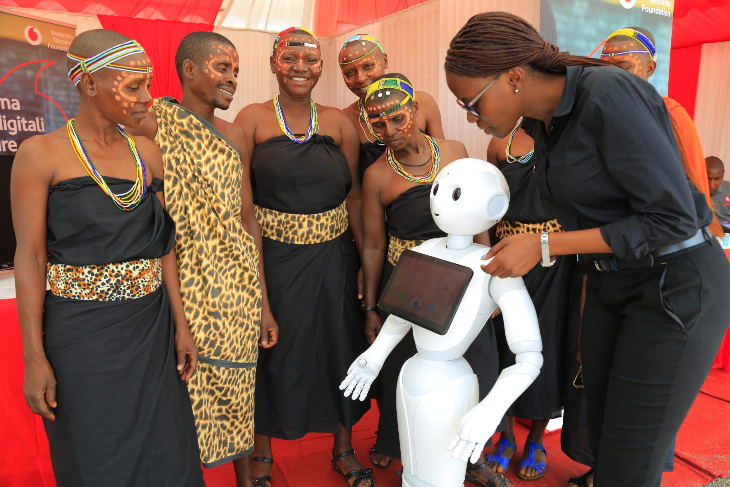 Mkuu wa kitengo cha mawasiliano Kampuni ya simu ya Vodacom Tanzania , Jacquiline Materu (kulia) akiwapa maelezo baadhi ya wananchi kuhusu kazi anazofanya roboti ajulikanaye kwa jina la Pepper ,walipotembelea banda la kampuni hiyo kwenye maonesho ya mashindano ya Sayansi,Teknolojia na Ubunifu yaliyoandaliwa na Wizara ya Elimu,Sayansi na Teknilojia kwenye uwanja wa Jamhuri jijini Dodoma leo.