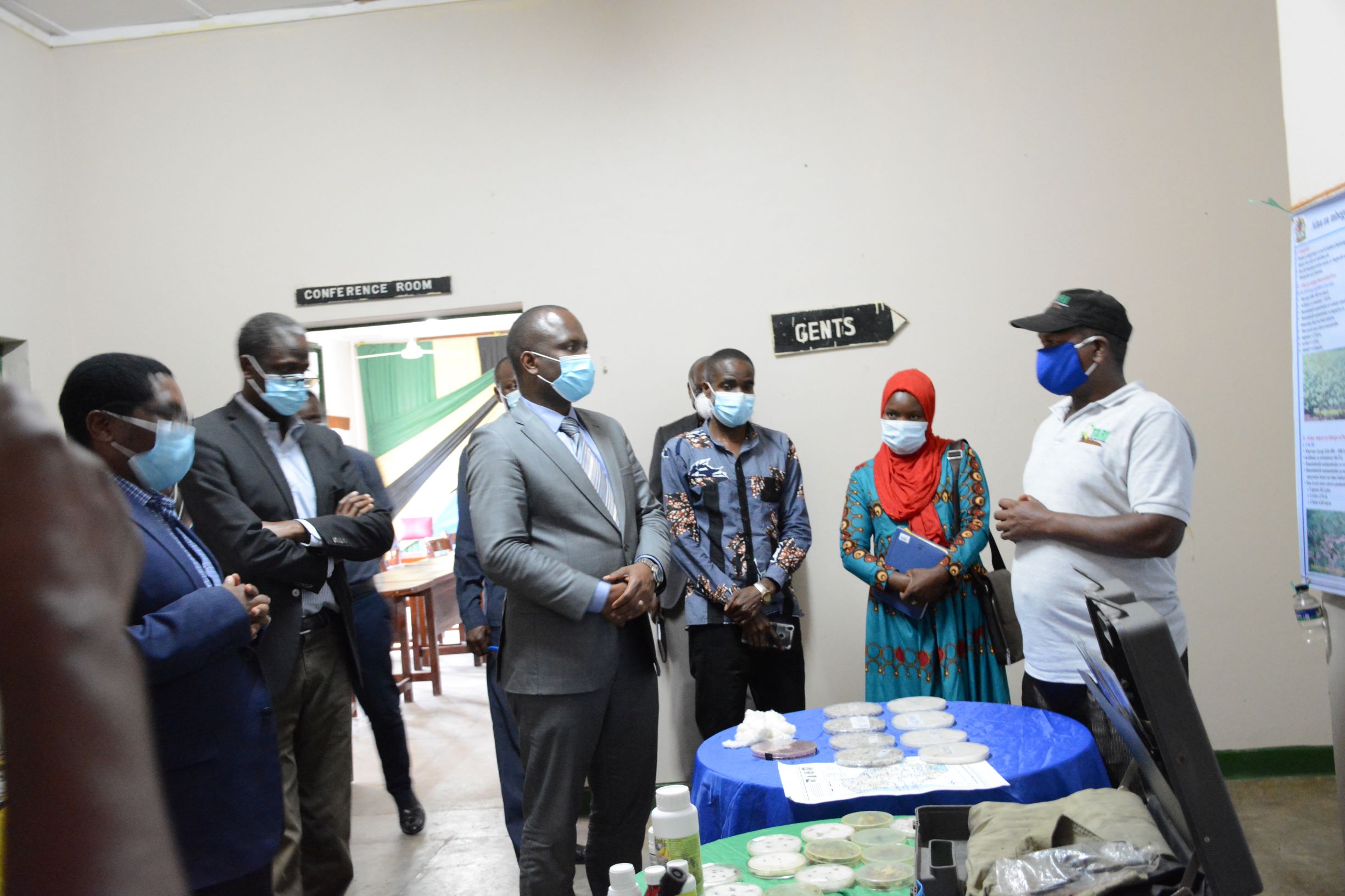 Katibu Mkuu Wizara ya Kilimo Bw.Gerald Kusaya (aliyevaa tai) akipata maelezo ya aina za mbegu bora ya pamba zilizogunduliwa na Kituo cha TARI Ukiriguru mkoa wa Mwanza leo.