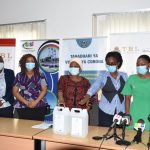 Mmiliki wa Kampuni ya SSMC Limited Saidi Mohamed akiwaaonyesha waandishi wa habari vitakasa mikono ambavyo vimetolewa