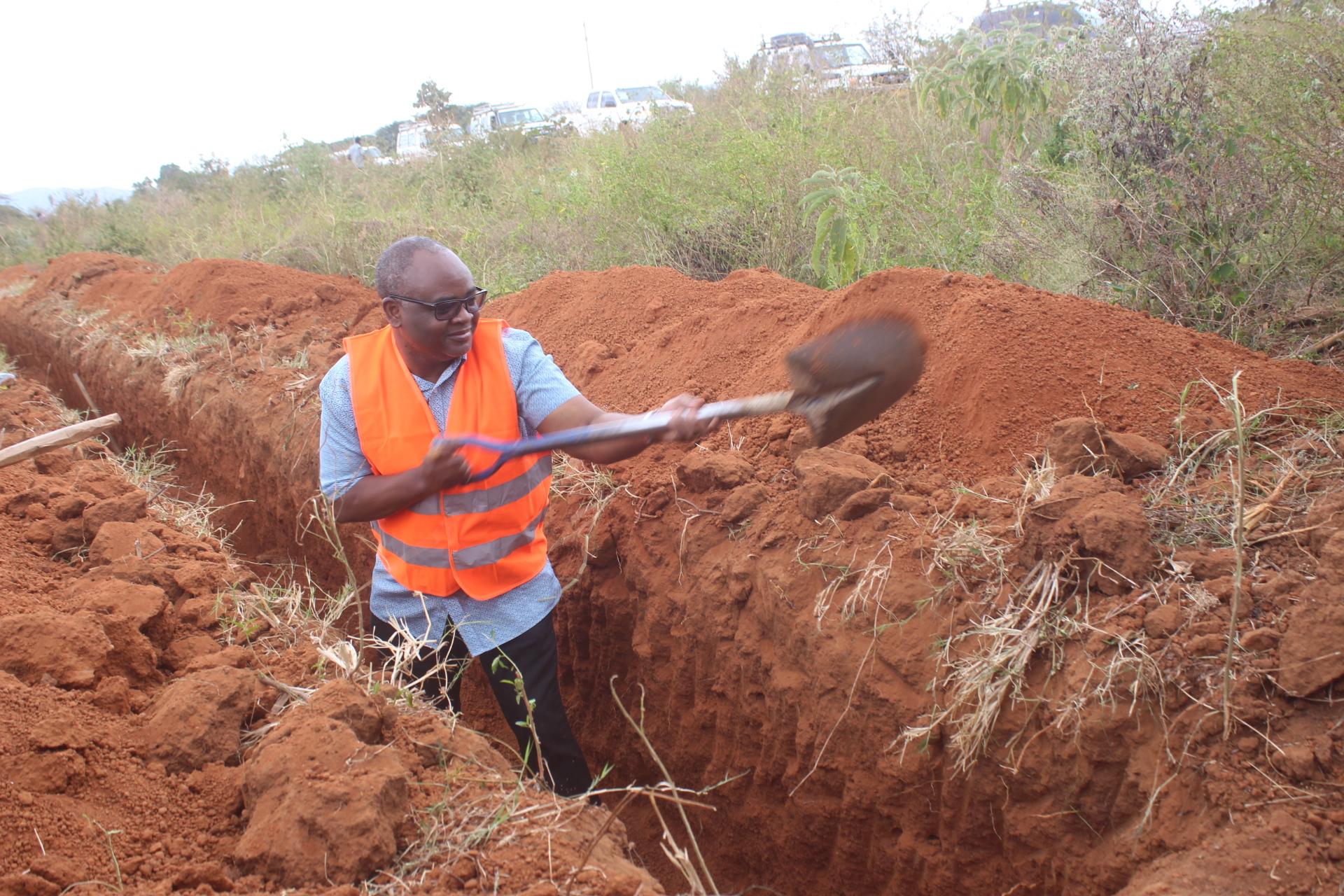Katibu Mkuu wa Wizara ya Maji, Profesa Kitila Mkumbo akishiriki kwenye uchimbaji wa mtaro wa kulaza bomba la maji kutoka kwenye chanzo hadi uwanja wa ndege wa Wilayani Chato.