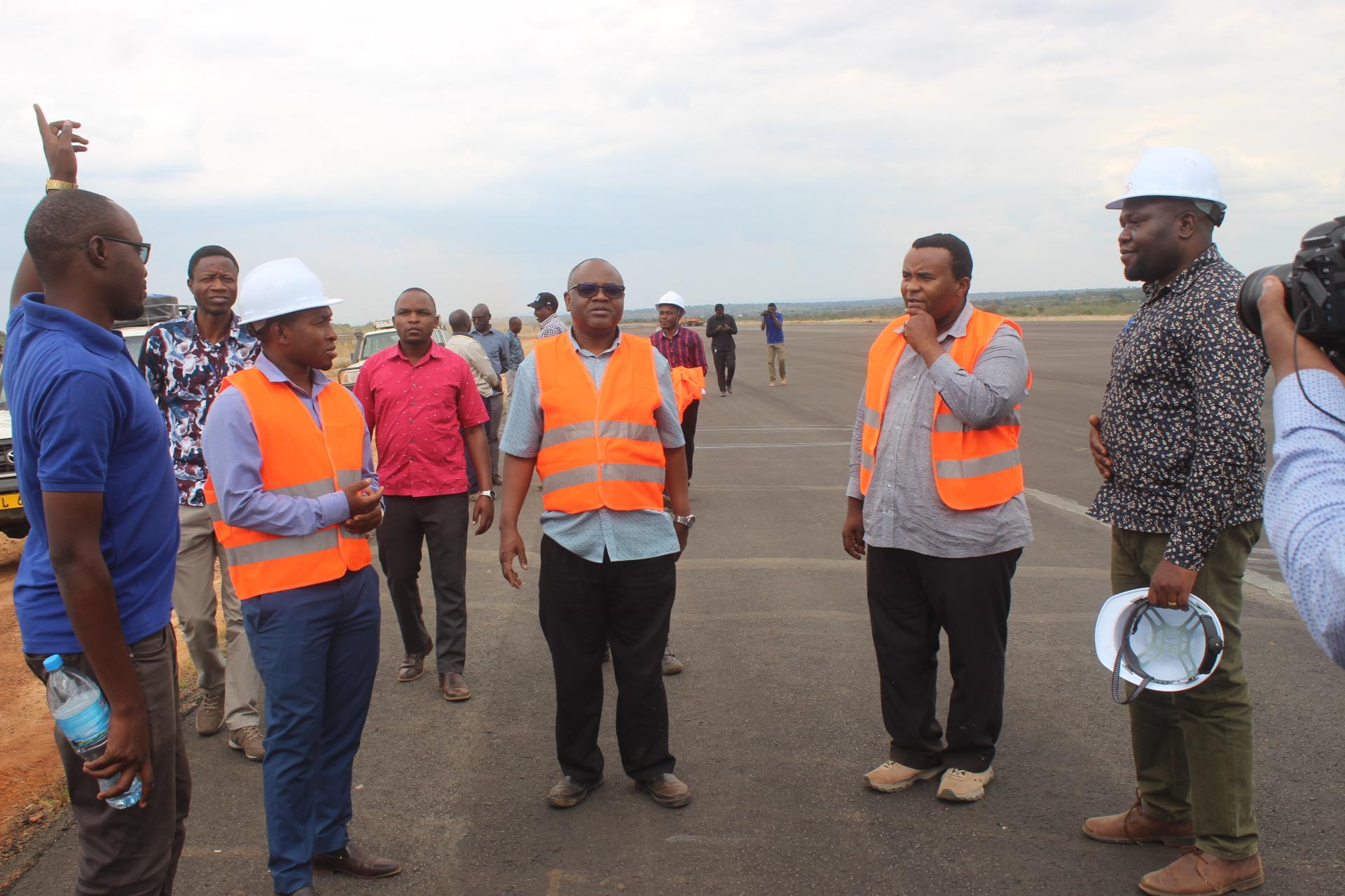 Katibu Mkuu wa Wizara ya Maji, Profesa Kitila Mkumbo (katikati) alipofanya ziara ya kukagua utekelezaji wa mradi wa kupeleka maji kwenye uwanja wa ndege wa Chato. Wa pili kulia ni Naibu wake, Mhandisi Anthony Sanga.