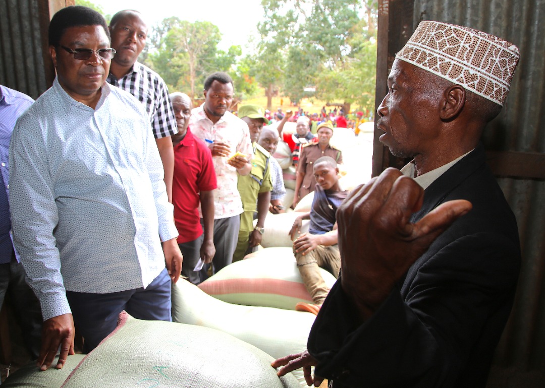 Waziri Mkuu, Kassim Majaliwa akizungumza na Mwenyekiti wa Chama cha Ushirika cha Msingi cha Nanjaru, Bakari Chuwa (kulia) wakati alipotembelea ghala la chama hicho akiwa katika ziara ya kikazi wilayani Ruangwa Juni 23, 2020. (Picha na Ofisi ya Waziri Mkuu)