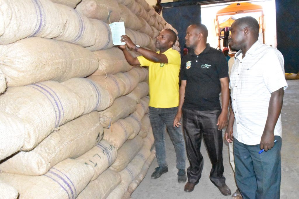 Afisa Ushirika wa wilaya ya Tunduru mkoani Ruvuma George Bisani katikati akikagua moja ya ghala la kuhifadhia korosho zilizozalishwa katika msimu wa 2020 kabla ya kuanza mnada wa kwanza wa zao hilo uliofanyika kijiji cha Muhesi ambapo zaidi ya tani 1902 zimekusanywa hadi kufikia jana hata hivyo wakulima wa zao hilo wamekaaa kuuza korosho zao kutokana na bei ndogo iliyotolewa na wafanyabiashara,kushoto Mkurugenzi wa kampuni ya Yuha Co Ltd inayojishughulisha na utunzaji wa maghala Khaji Thabiti,