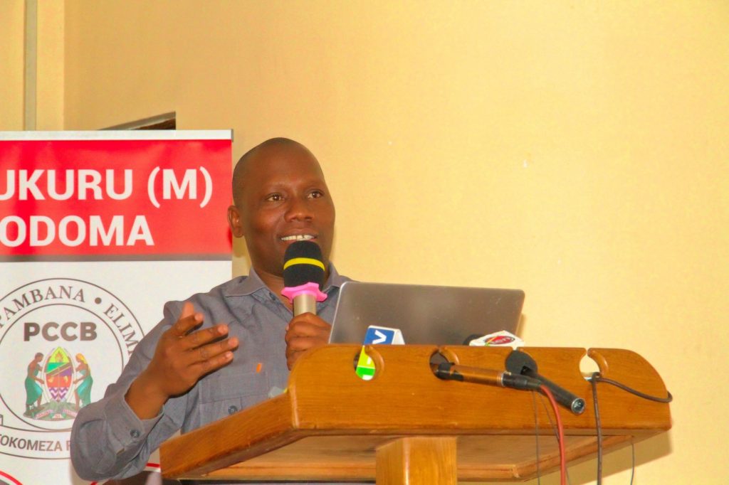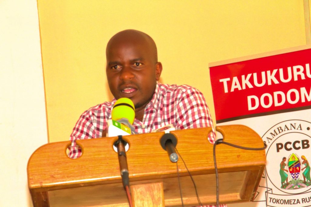 Mkuu wa Taasisi ya Kuzuia na Kupambana na Rushwa(TAKUKURU) Dodoma,Sosthenes Kibwengo,akizungumza kwenye mahafali ya wahitimu wa kidato cha nne wanachama wa klabu za wapinga Rushwa kwa shule nane zilizopo jijini Dodoma.