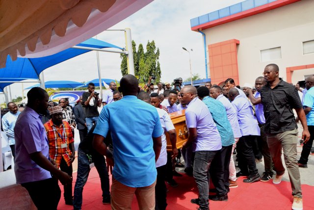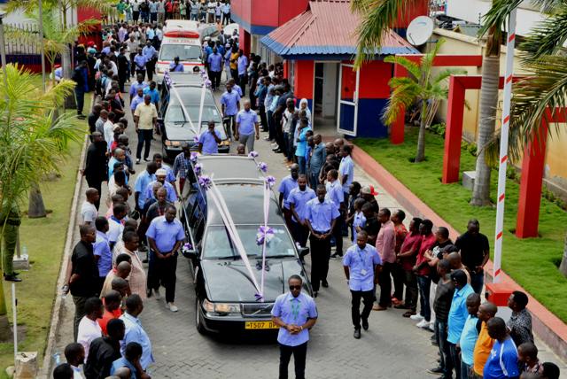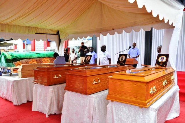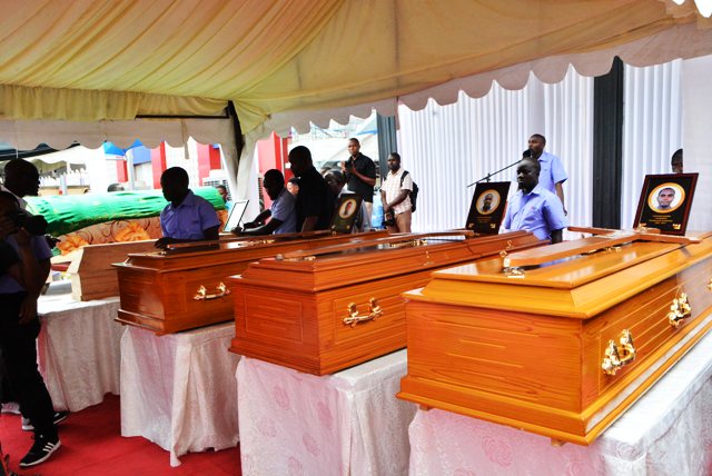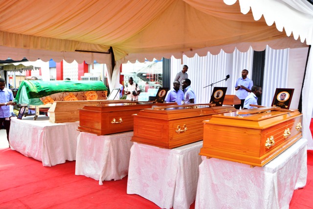 Majeneza yenye miili ya waliokuwa wafanyakazi wa Azam Media yakiwa yamepangwa vyema tayari kwa shughuli ya kutoa heshima za mwisho.